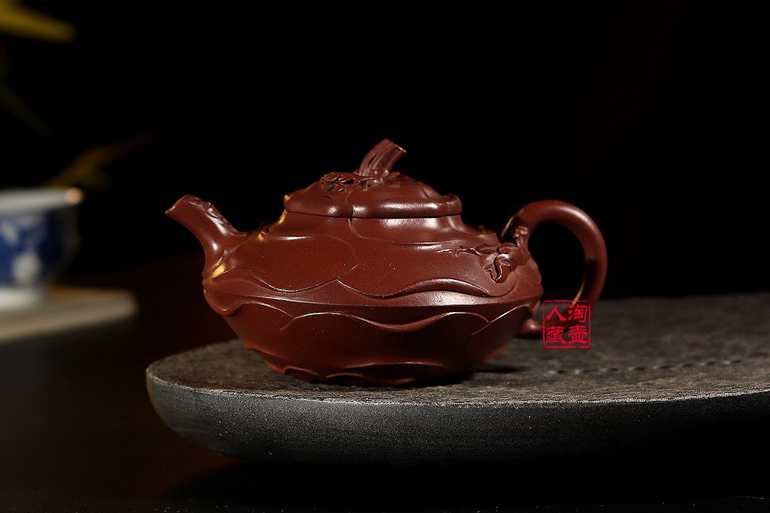 盖与口取葵形相合,紧密度佳,壶流以葵叶自然包裹而成,形态仿生却不刻意,出水流畅利落,壶把则精刻筋纹,纹路清晰毕露,握于手中骨力舒展,贴合掌心弧度,手感温润称手。整体观之,此壶将自然之美与紫砂工艺完美融合,堪称紫砂花货中的上乘之作。