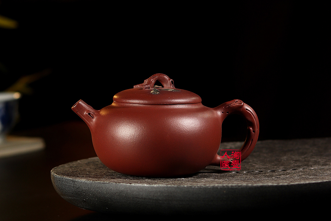 此壶为作者选用原矿紫泥,全手工精制而成,色泽温润莹亮,使用称手舒适。壶身圆融饱满,钮、流、把宛若枝干胥出,苍劲斑驳。盖面贴塑枝叶成点睛之笔,巧妙的泥色对比,表现出绿叶逐渐枯黄的情境,揭示自然生命之轮回。整壶工艺精美,装饰细腻,赏用俱佳,是一款值得入手的高性价比花器。