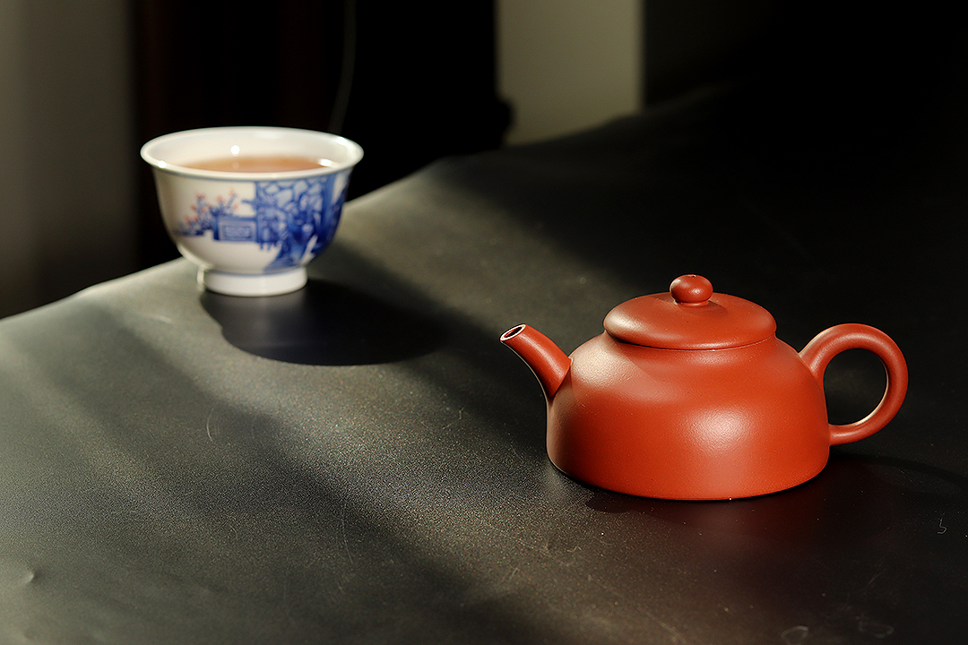压盖半弧,盖钮珠圆玉润,一弯流胥出,嘴沿削切利落,有刚柔并济之美,环形壶把如满弓蓄势,与流嘴曲势应和。整器于光润雅致中包含巧思,美观耐看的同时,实用性也得到很好的彰显。