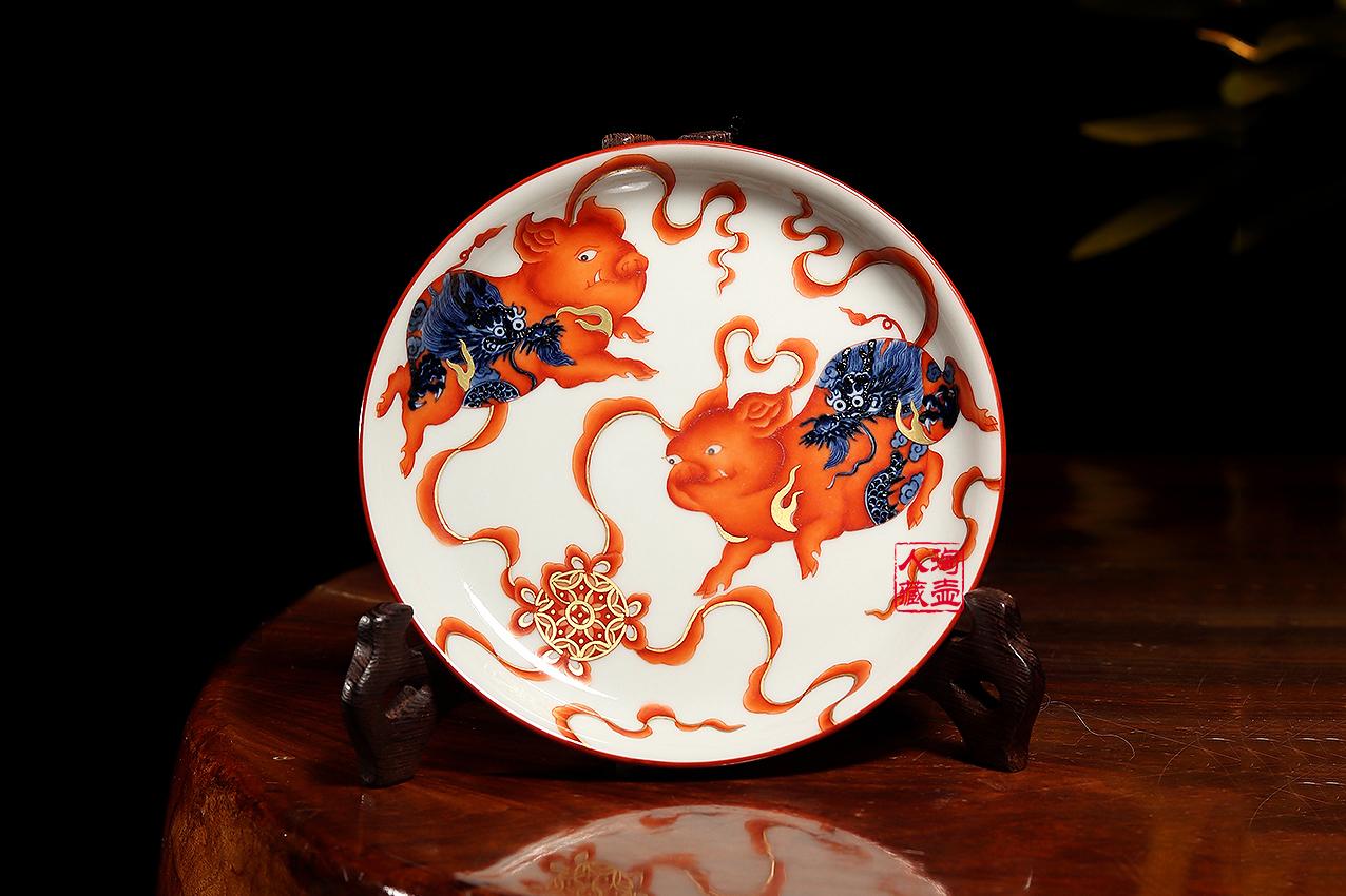 查看作品此件猪龙长乐壶承,取经典浅腹圈足造型,线条凝练,简约又不失雅致,通体施釉均匀,釉面光洁莹润如凝脂。器物内外壁皆以猪龙纹样为饰,矾红彩勾勒猪的形象,身躯圆硕,四肢短小而矫健,正奋力追逐着眼前的绣球,神情灵动可爱,憨态栩栩如生,猪背上一抹幽蓝,是为青花绘就的龙,龙身蜿蜒舒展,鳞片清晰可见,在青花的映衬下,矾红彩更显色泽艳丽夺目,红蓝相映,冷暖交织,形成强烈而和谐的视觉冲击。