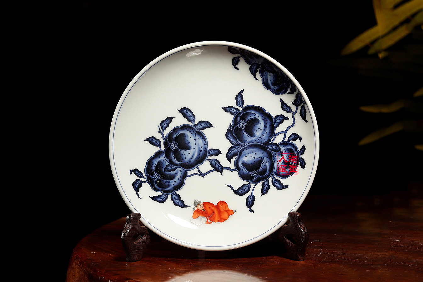 查看作品此件局外人李白壶承,胎质洁白细腻,釉面柔和莹润,撇口浅腹,圈足规整,器型简洁大方,装饰上融合了青花与矾红两大传统工艺,青花绘制的橘子为画面主体,橘果饱满硕大,橘皮纹理逼真,色彩浓淡相宜,层次感十足。