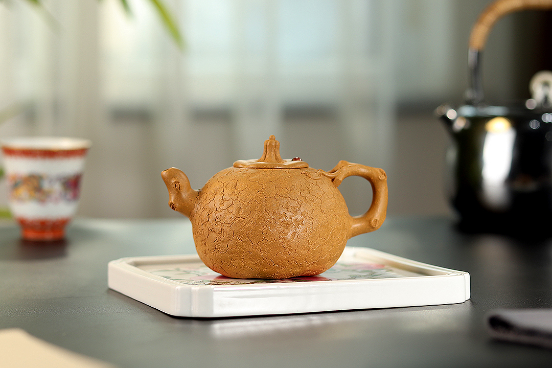 瓜蒂形壶盖嵌入壶口,其上瓜柄作钮,以树枝造型构筑壶之流、把,把与身筒接连处贴塑树枝攀附于壶上,苍古嶙峋之姿尤显古味,盖面贴塑一只栩栩如生的瓢虫,静中寓动的巧思,令整器焕发生机。此壶韵味古雅,做工精到,将供春壶之形神韵展露无遗,藏用俱佳之器也。