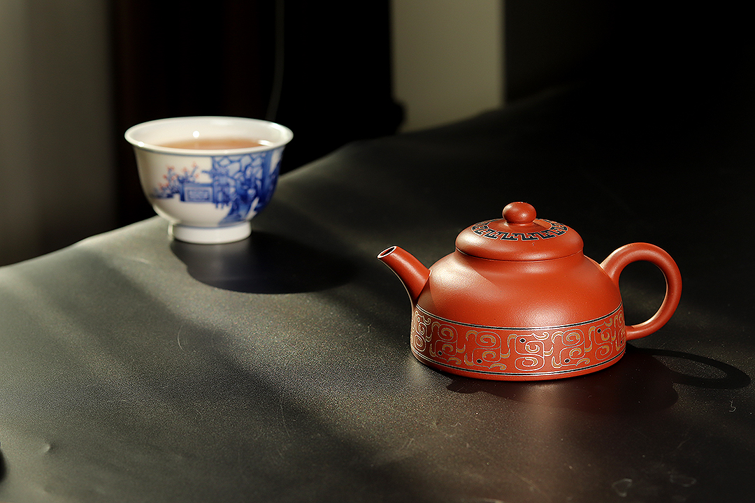 作者采嵌银丝工艺于壶体装饰商周青铜纹样,壶身下部施凤鸟纹,盖面施几何纹,皆以纤细银丝勾勒轮廓,辅以异色泥料填充,银线冷冽的光泽与紫砂胎体温润的朱红色形成微妙对比,既还原了青铜时代的庄重气韵,又赋予紫砂器物流动的金属感,在拙朴的茶器形制中,完美复现了商周青铜美学的神秘与瑰丽。