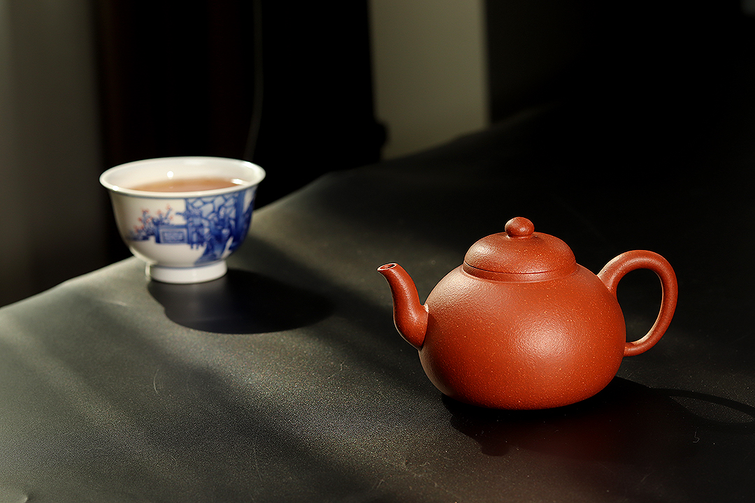 壶身扁矮敦实,线条自上而下渐次丰盈,气势沉稳,盎盖与短颈衔接若天成,盖面扁钮圆润可人,与壶身造型呼应成趣,三弯流、耳形把左右相衬,比例协调。整器既得实用之便,又具视觉之美,可谓超性价比实用器。