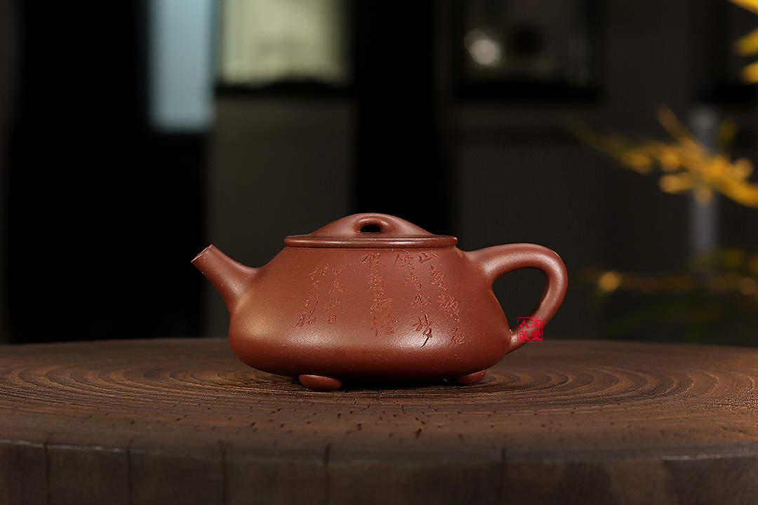 壶身由宜兴书协主席庞现军亲自操刀刻饰,正面镌“山寺静,石钟鸣,幽梦破,看茶经”,落款“甲辰秋月 耕夫刻铭”,反面刻绘国画中的经典兰石图,怪石嶙峋,幽兰吐芳,寥寥数刀便刻画出生动的自然景象,彰显过人的陶刻功夫。庞老师的陶刻作品轻易不示人,但凡出品,必是精品,此壶陶刻不仅技法精到,内容也独一无二,加之胡海菲老师对石瓢壶型的纯熟演绎,实属难得,力荐珍藏。