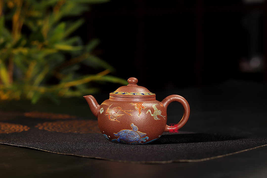 壶体装饰尤为吸睛,别出心裁地将景泰蓝描金工艺与紫砂结合,壶身绘有仙鹤、神龟等瑞兽,壶盖边缘则作几何纹样,运用红、蓝、绿、白多种色彩,又辅以描金勾勒,图案典雅,色彩富丽,有宫廷器之风,且技艺复杂,工序繁多,对制作者是极大的挑战。整把壶在紫砂的质朴底色上,绽放出华丽璀璨的艺术光彩,既保留了传统紫砂器的实用功能,更升华为一件兼具收藏价值与观赏性的工艺珍品。