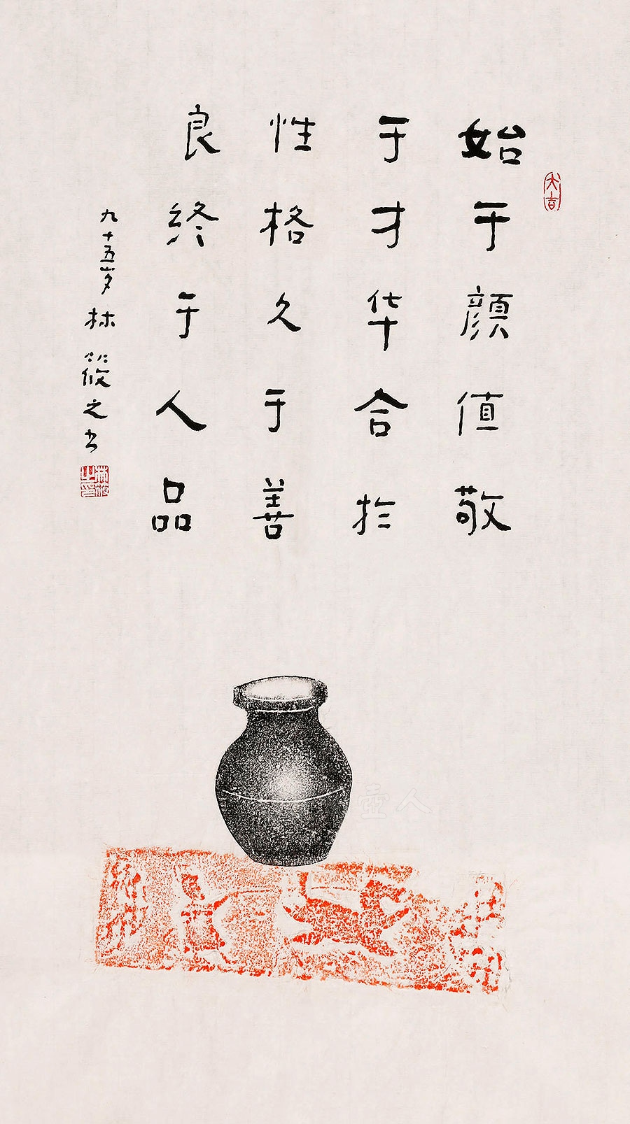 林筱之(1928-2023),书画大师林散之之子,世称 “当代唐伯虎”。三岁识字,五岁随父学书画,后师从黄宾虹,六十载临习黄子久、石涛等名家画作,兼学二王、颜真卿等碑帖,书风近父,平稳秀逸,笔含灵气。其 “钩手” 执笔、悬腕中锋得父传,尽显一家风骨。