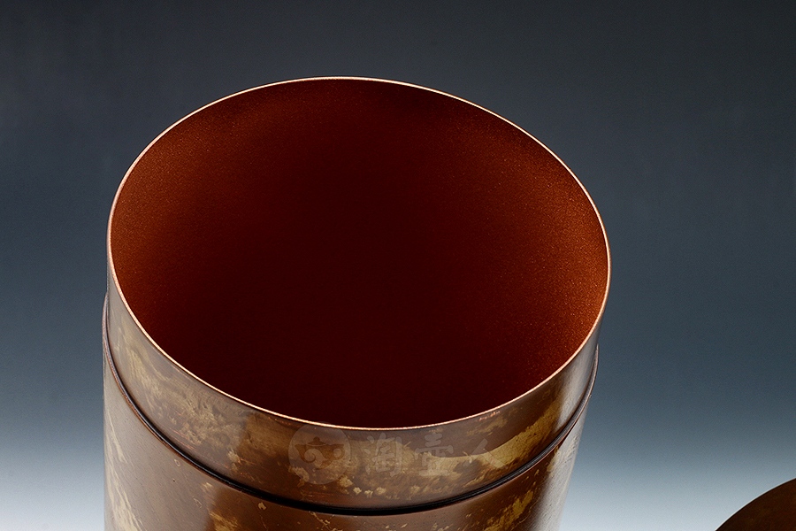 纯紫铜打造,采用“斑斓彩”装饰。金色的流火般的花纹,既象征着铜在火中锻造,又蕴含着茶在火上焙烤。寓意美好,工艺繁复,纹样各异,与铜面相得益彰。