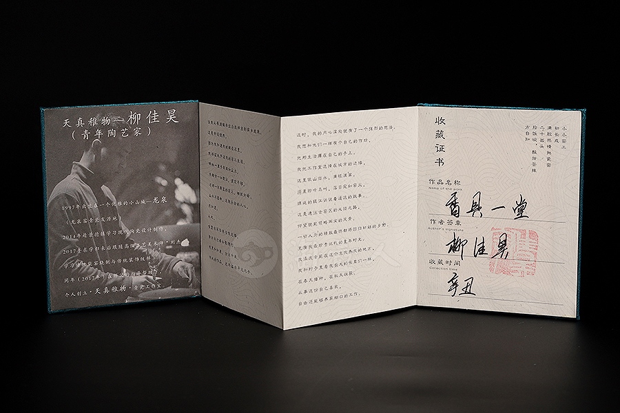 柳佳昊,男,1997年生于浙江龙泉,2014年毕业于龙泉中职校青瓷专业,同年赴景德镇学习现代陶瓷设计制作。2017年求学归来,跟随刘杰学习传统柴窑烧制技艺,同年在师傅刘杰的帮助下创办个人工作室“天真稚物”。作品古朴自然,明净简洁。以古瓷标本为师,潜心研习釉水与烧制工艺。