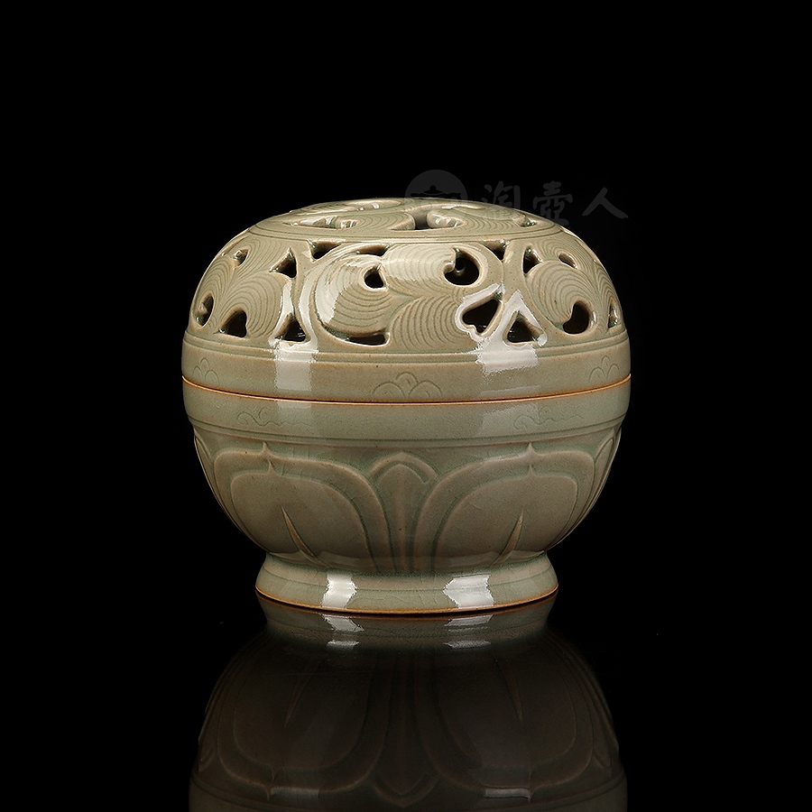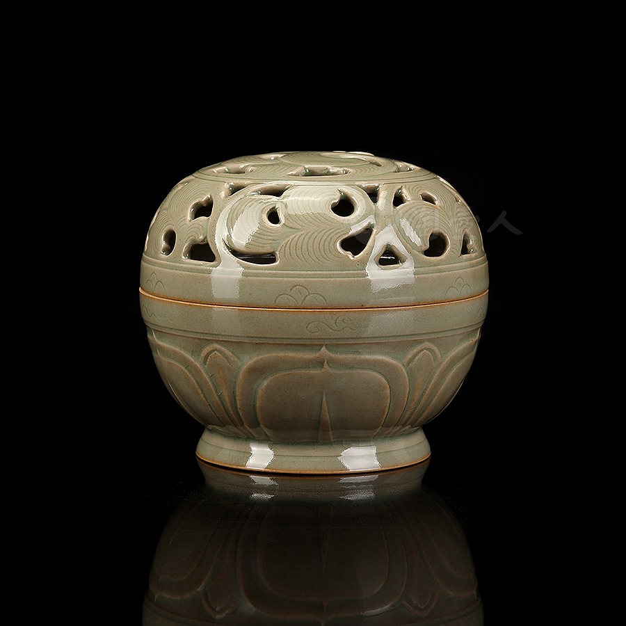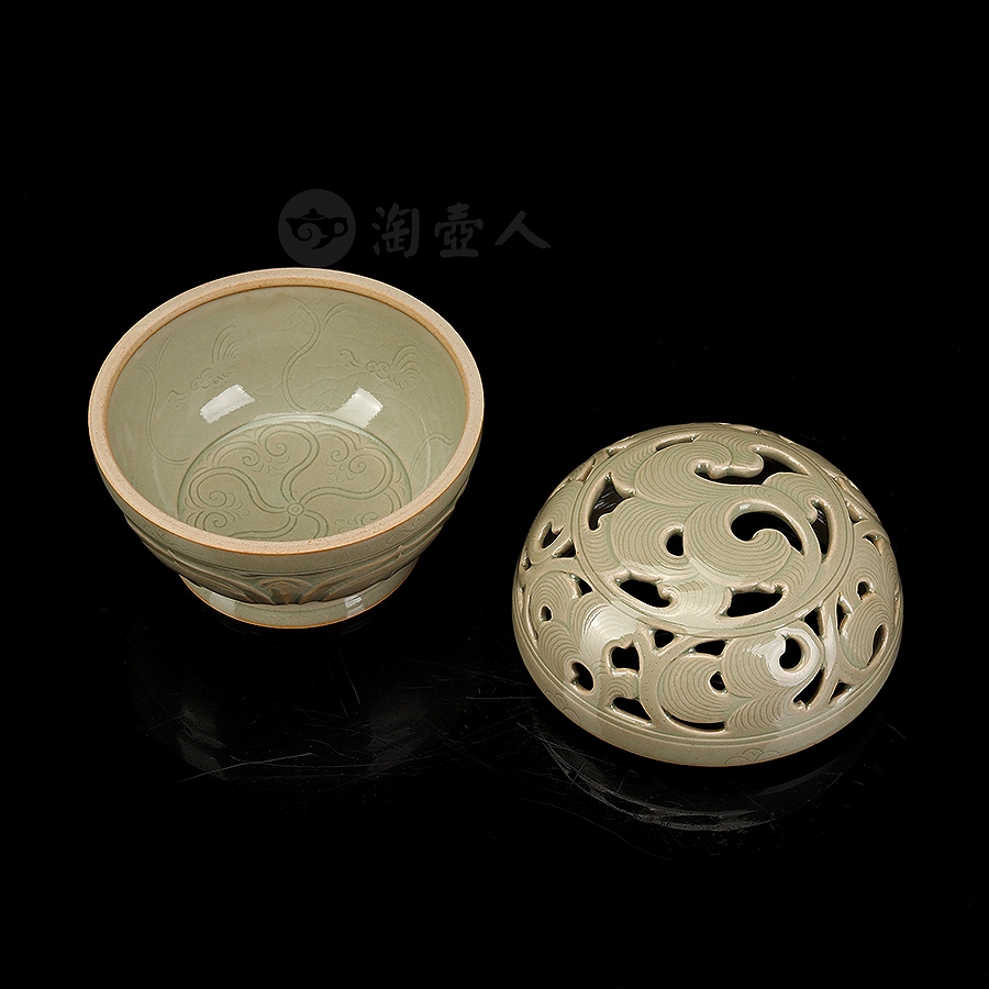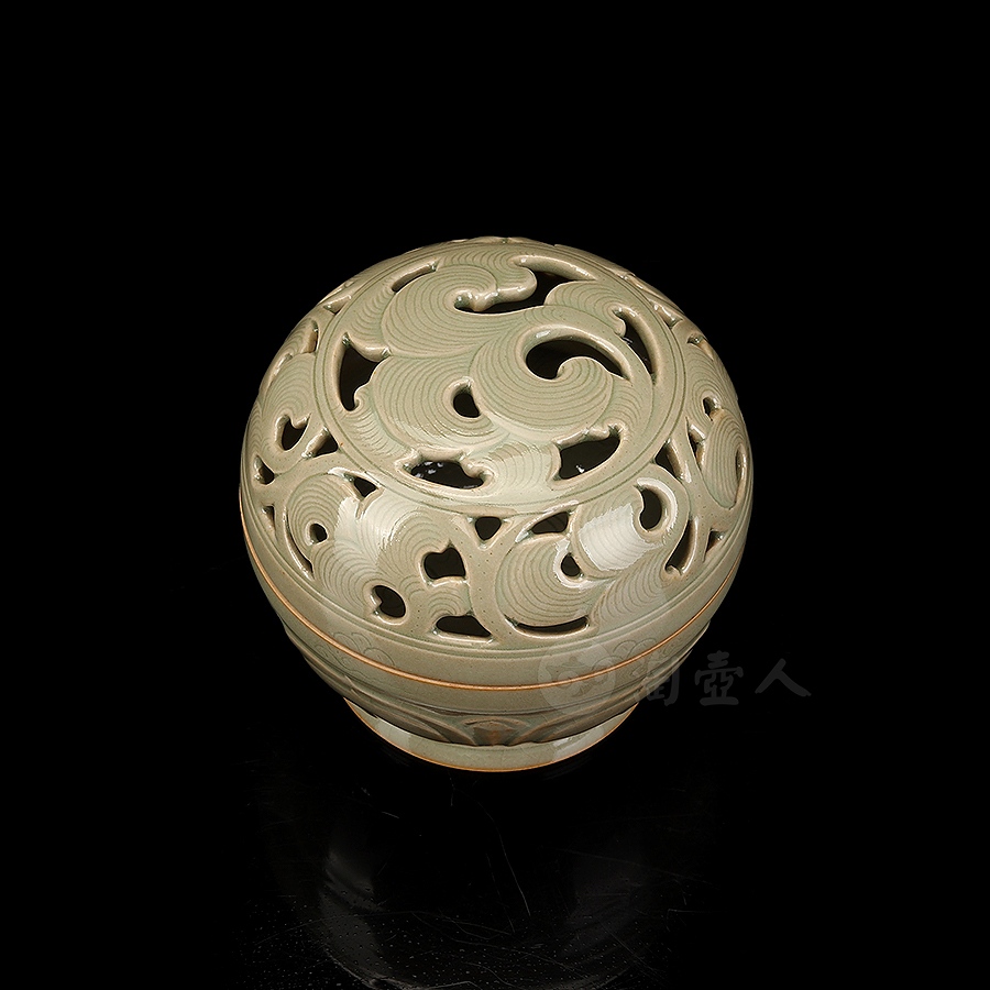 盖身完美扣合,盖面作缠枝纹镂空,缠枝纹上又有阴刻丝线,刻花极为精细,层次分明,圈足外撇,近足处饰一周双层仰莲纹,莲瓣立体,工精艺巧,颇具观赏性。小巧一只,把玩于手中,意趣十足,抑或以之焚香,境界超凡,实谓雅事一桩。
