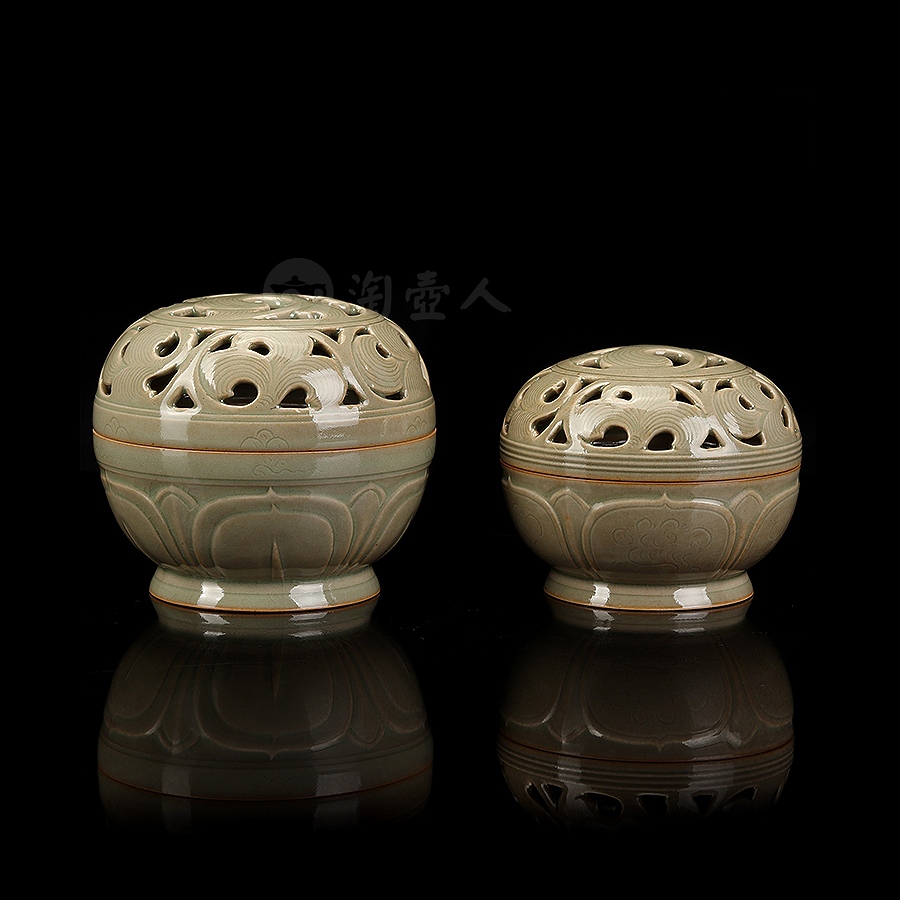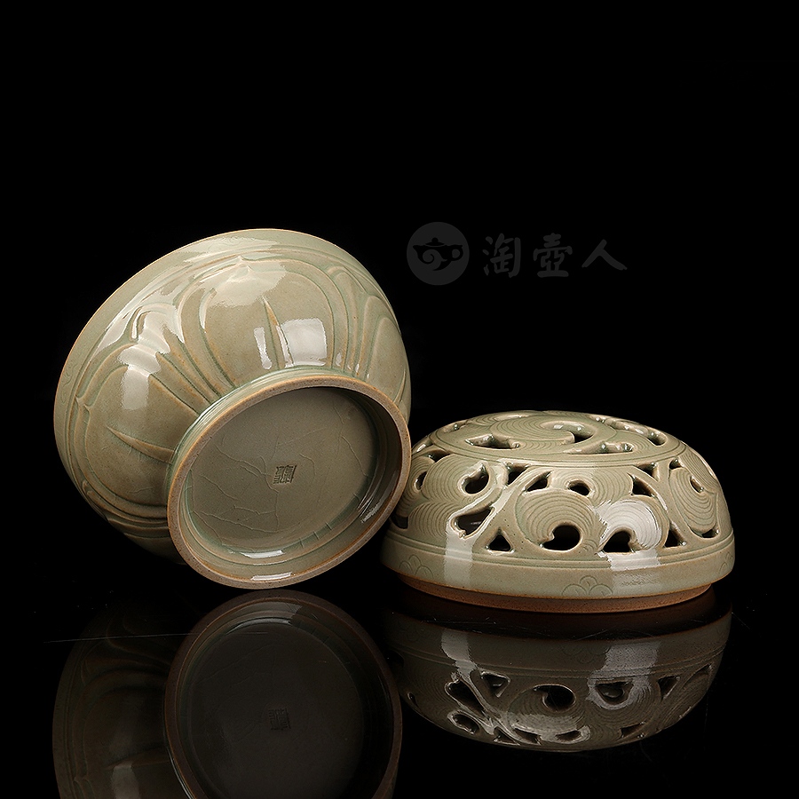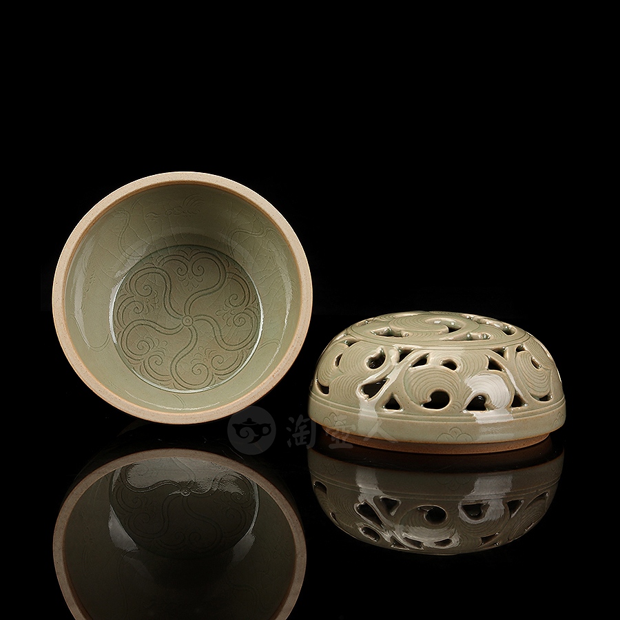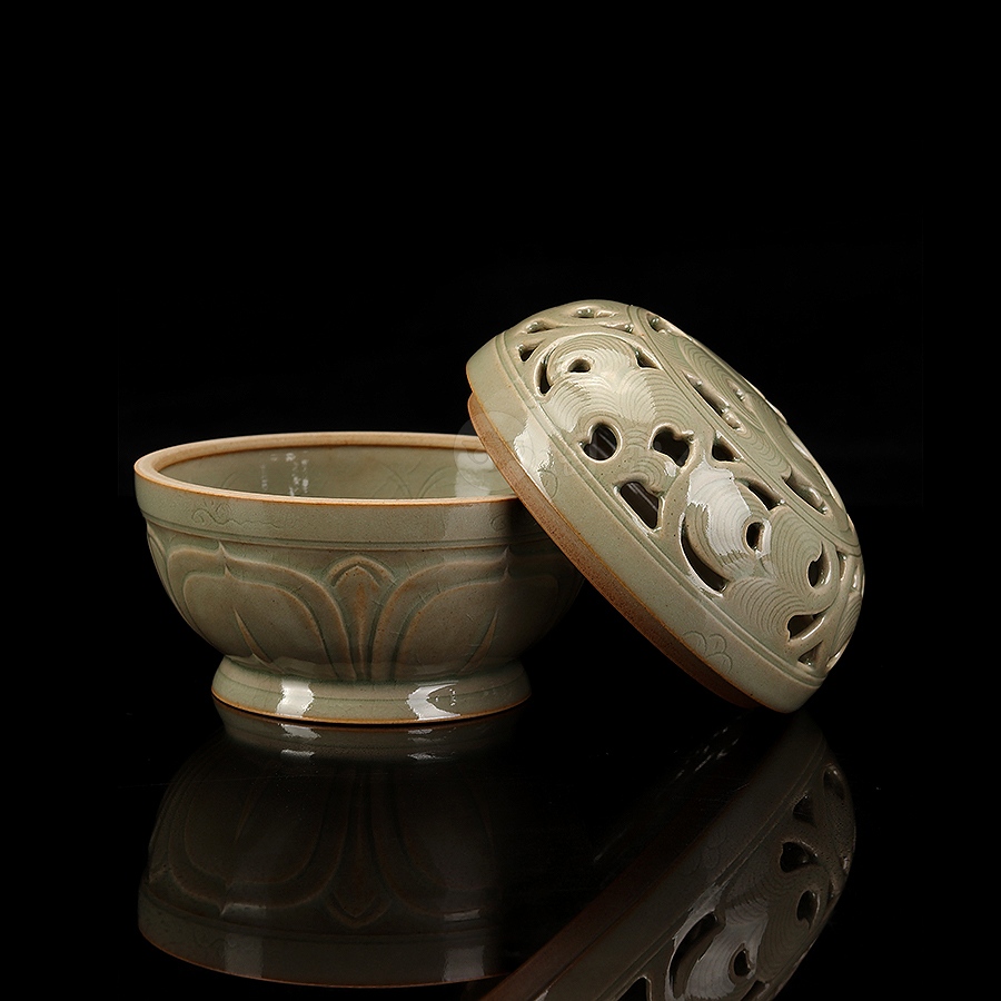 盖身完美扣合,盖面作缠枝纹镂空,缠枝纹上又有阴刻丝线,刻花极为精细,层次分明,圈足外撇,近足处饰一周双层仰莲纹,莲瓣立体,工精艺巧,颇具观赏性。小巧一只,把玩于手中,意趣十足,抑或以之焚香,境界超凡,实谓雅事一桩。