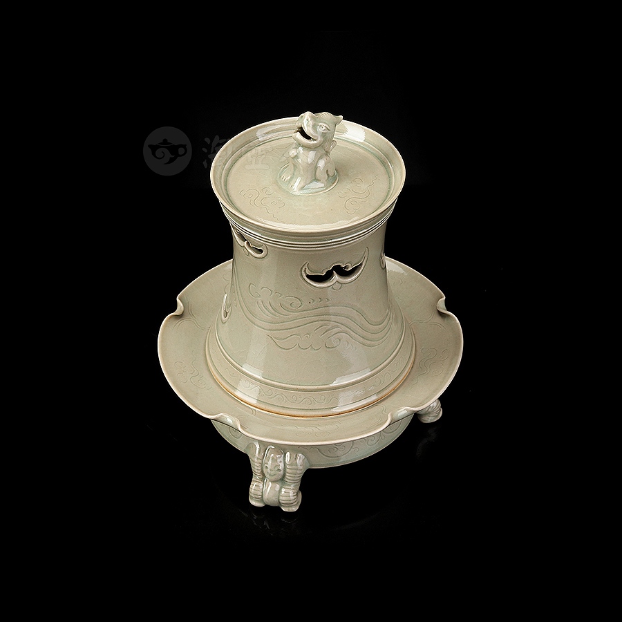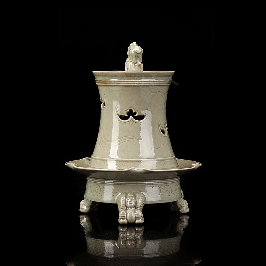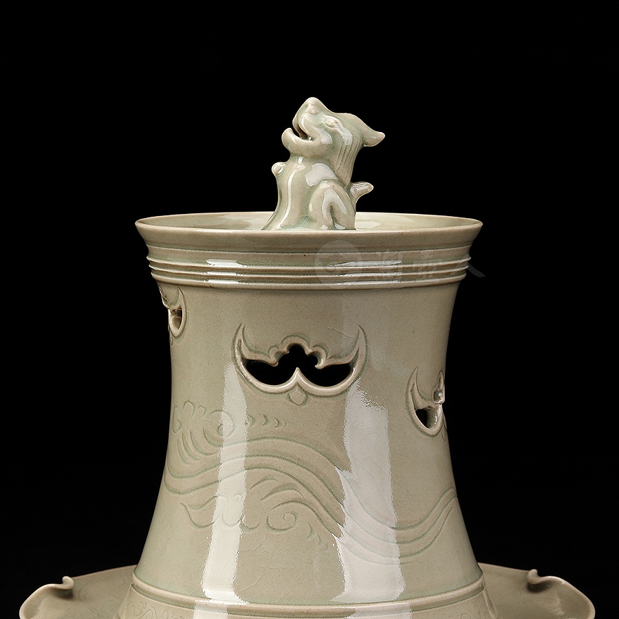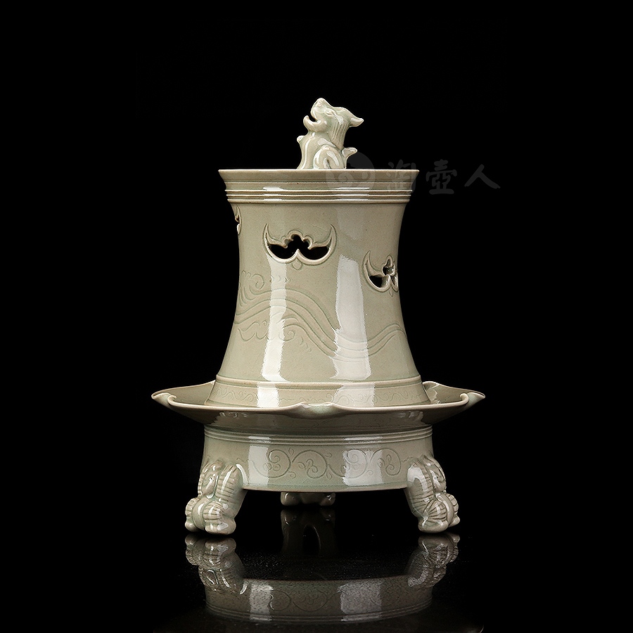 此件瑞座五福熏,其胎体纤薄匀净,通施秘色釉,更显古雅清贵。炉体采用分体式设计,由炉盖与炉身两部分精巧扣合而成,浑然一体,天衣无缝。炉盖呈束腰长筒形,盖顶塑一蹲踞瑞兽为钮,兽首昂然向天,姿态威仪,似在吞吐天地灵气,盖壁之上,祥云纹饰婉转流动,其间匠心独运地开出五处蝙蝠形镂空,“五蝠”正寓“五福临门”之祥瑞深意。焚香之时,轻烟便自这蝠形孔窍中袅袅逸出,萦绕升腾,若仙云缭绕,顿生缥缈出尘、如入琼阁仙境之感。
