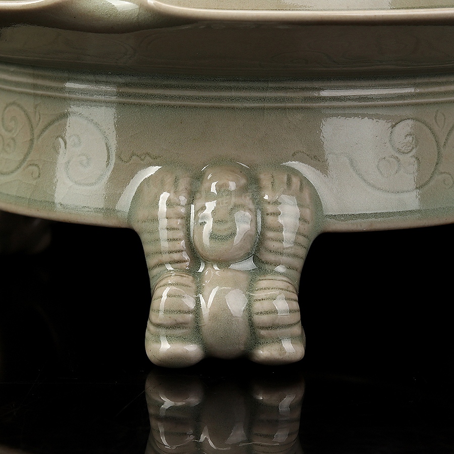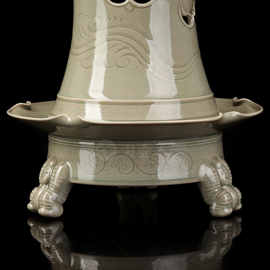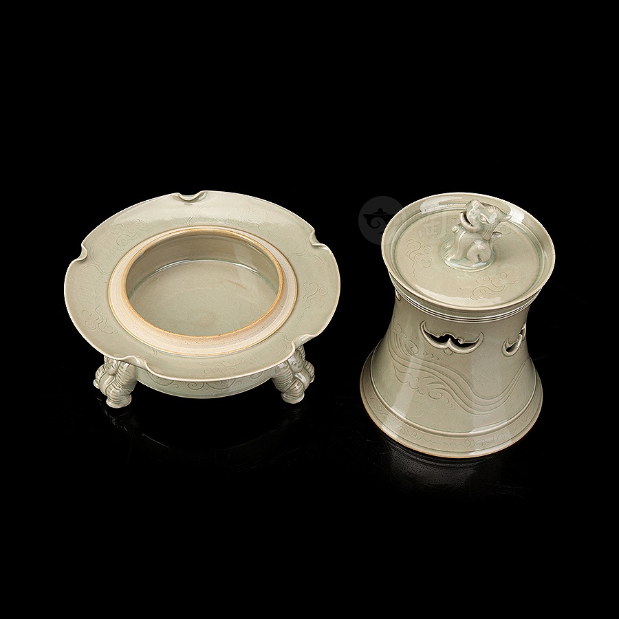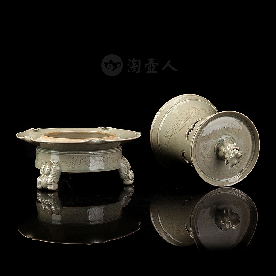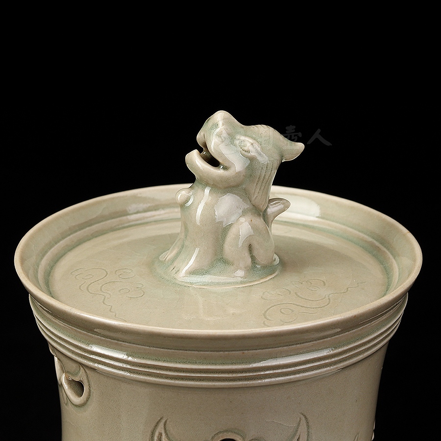 此件瑞座五福熏,其胎体纤薄匀净,通施秘色釉,更显古雅清贵。炉体采用分体式设计,由炉盖与炉身两部分精巧扣合而成,浑然一体,天衣无缝。炉盖呈束腰长筒形,盖顶塑一蹲踞瑞兽为钮,兽首昂然向天,姿态威仪,似在吞吐天地灵气,盖壁之上,祥云纹饰婉转流动,其间匠心独运地开出五处蝙蝠形镂空,“五蝠”正寓“五福临门”之祥瑞深意。焚香之时,轻烟便自这蝠形孔窍中袅袅逸出,萦绕升腾,若仙云缭绕,顿生缥缈出尘、如入琼阁仙境之感。