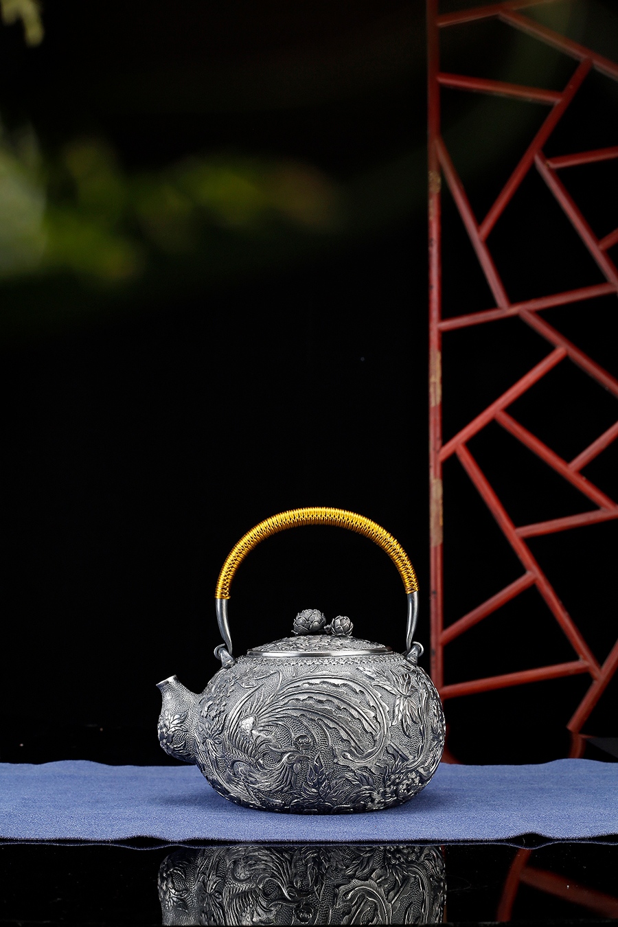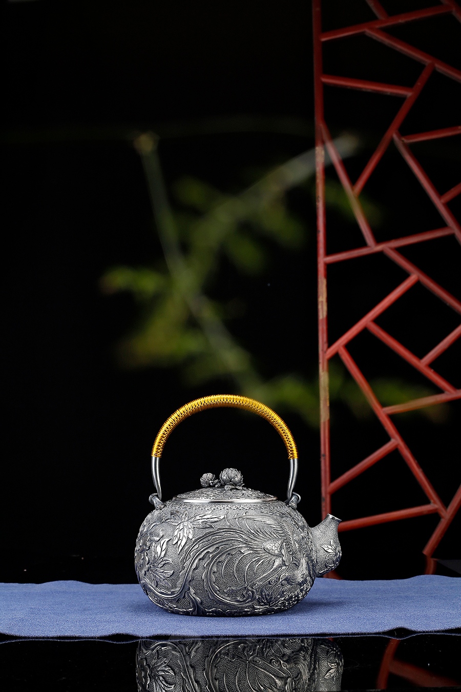《凤戏牡丹》为方寸堂精选纯银S999全手打造而成。将雪花银的光鲜亮丽与做旧的壶体形成鲜明对比。壶体细小锤纹、编织提梁绳,并用满雕手法錾刻以凤凰牡丹花纹,工艺繁杂精湛。