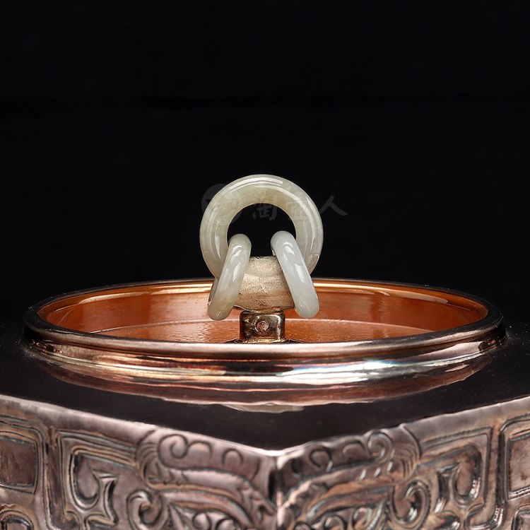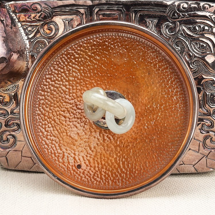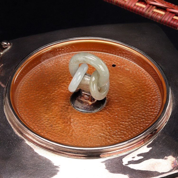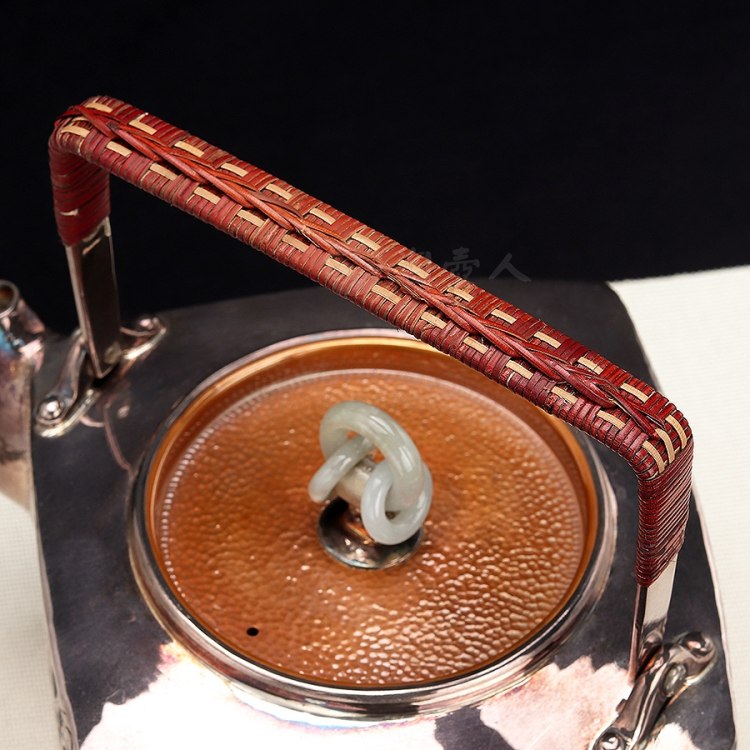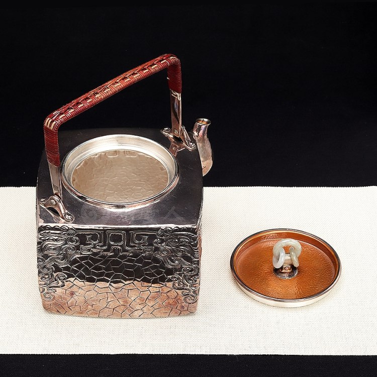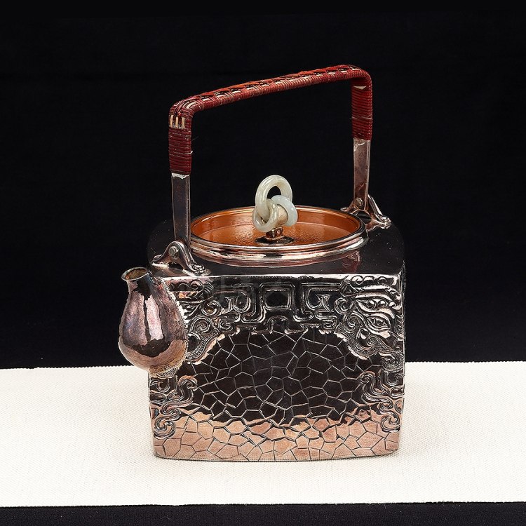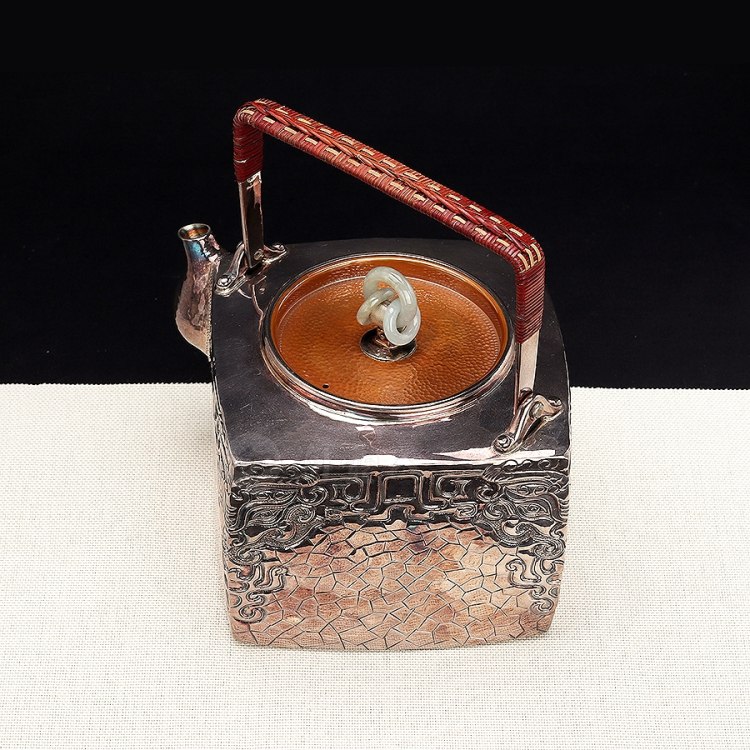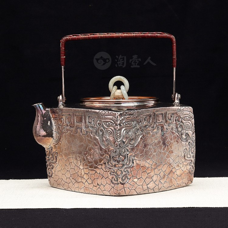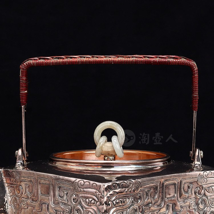 壶呈四方,线条挺括,方正有力。壶身錾刻古代传统饕餮纹饰,配以如意玉环作钮,再以藤编缠绕提梁,整壶于华贵中又有独到的传统气息,文化底蕴深厚,兼具观赏性和实用性,值得收藏。