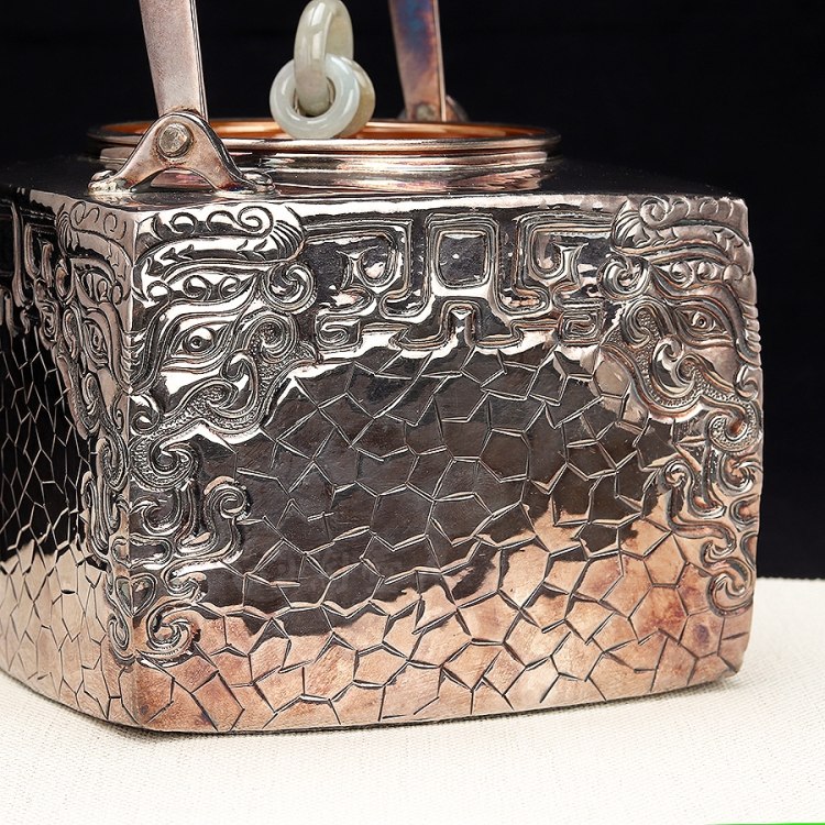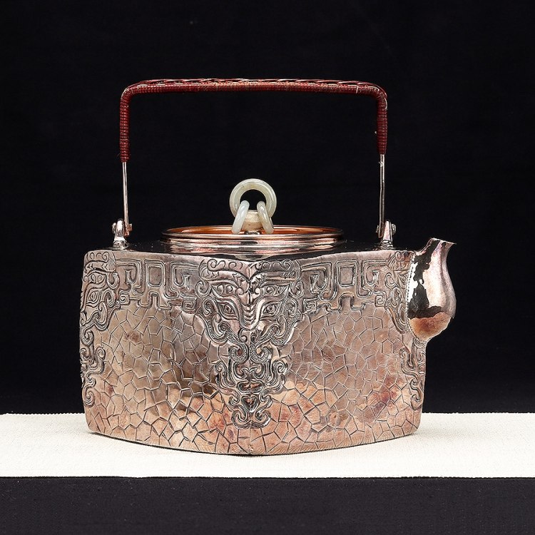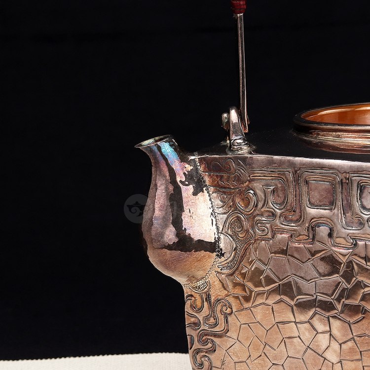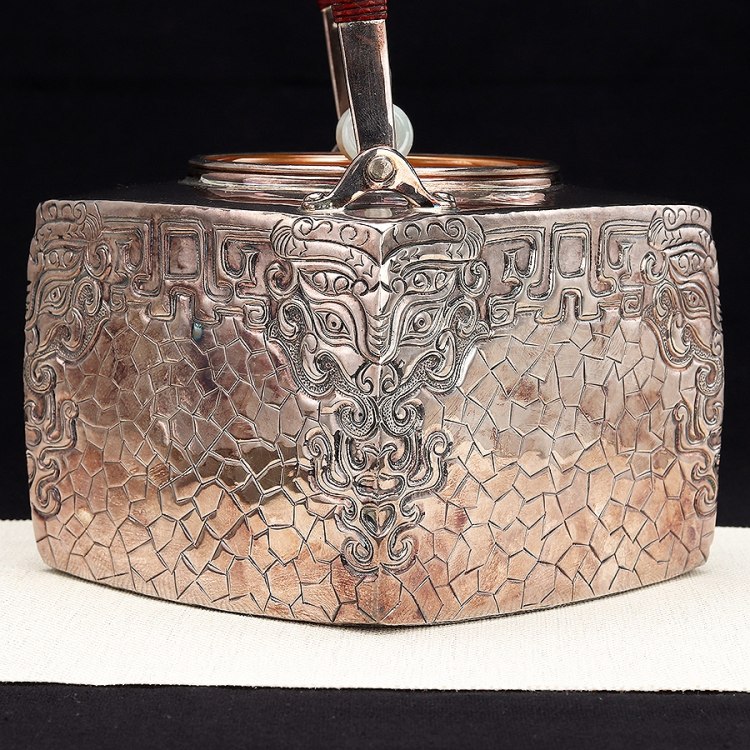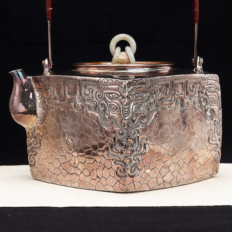 《四方饕餮纹提梁》精选纯银S999全手打造而成。壶体表面以冰裂锤纹装饰,并精心打磨抛光,壶体看似斑驳陆离,老味十足,实则触感丰富。将华丽的银饰感觉塑造的古朴拙味,逸趣横生。