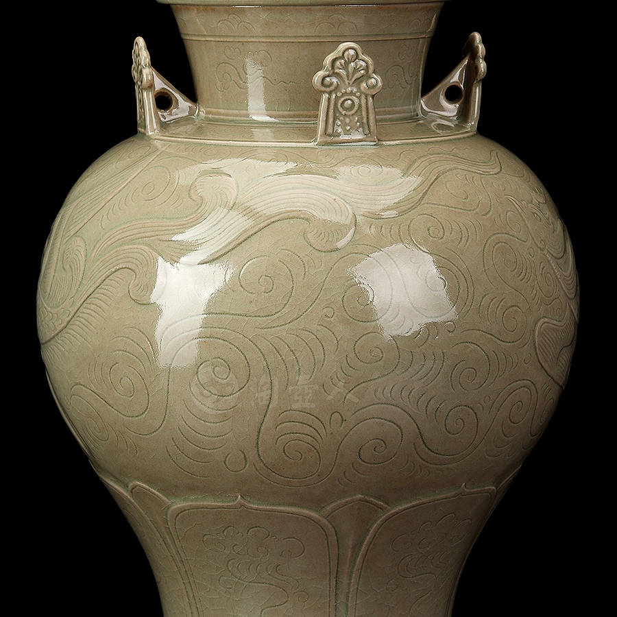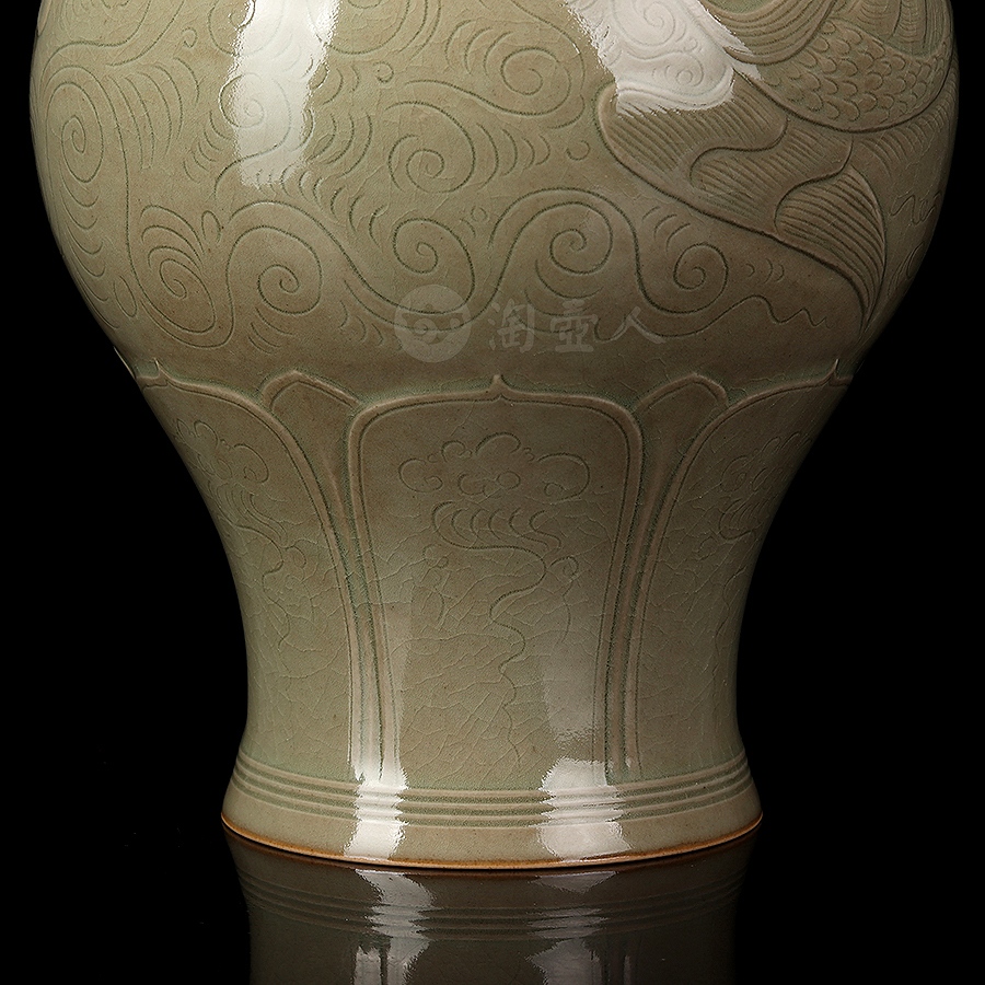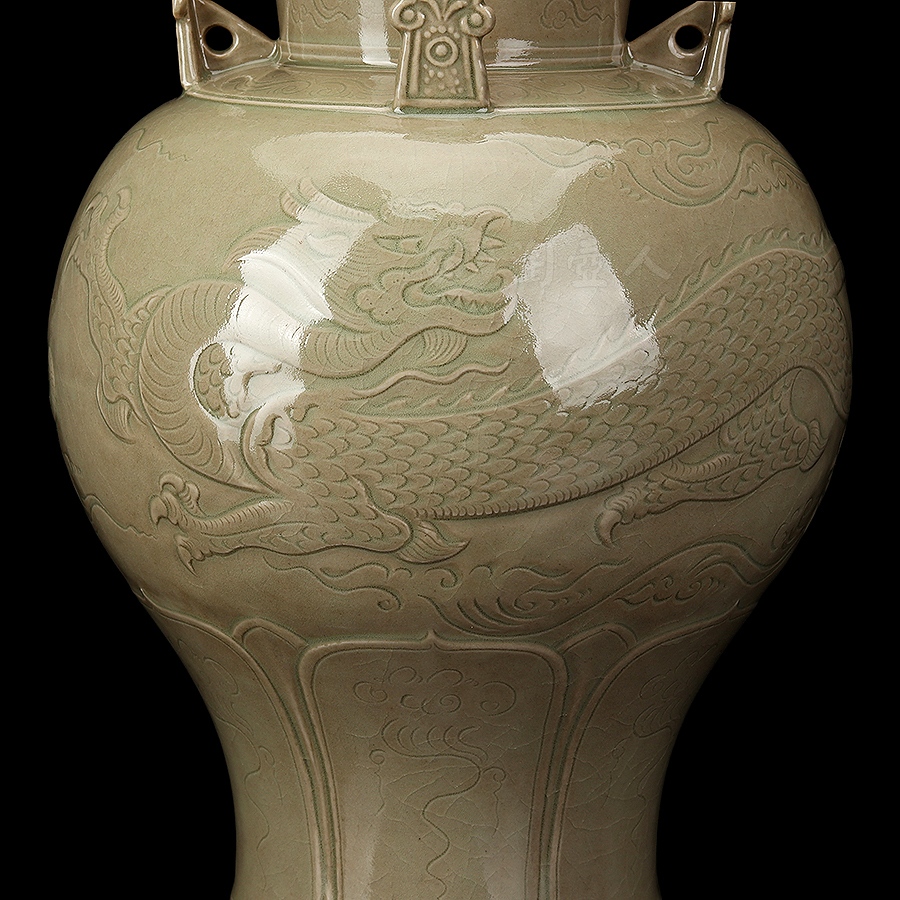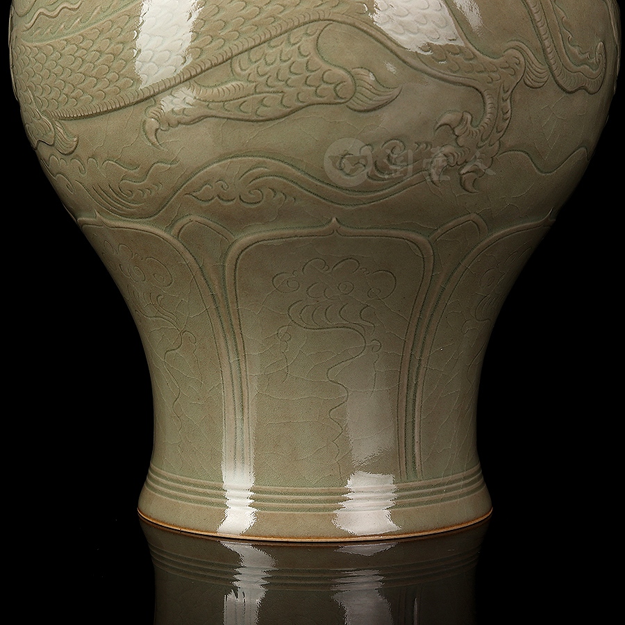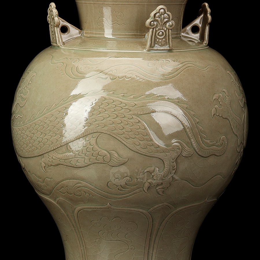 瓶身运用精湛的刻花技法,分别浮雕威仪赫赫的龙与凤,龙腾四海,凤舞九天,鳞羽毕现,神采奕奕,浮雕层次分明,立体感极强,于光影流转间展现出摄人心魄的动态美感,近足处环绕一周双重莲瓣纹饰,宛如莲台托起器身。