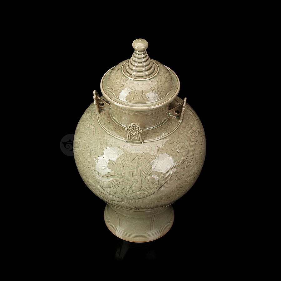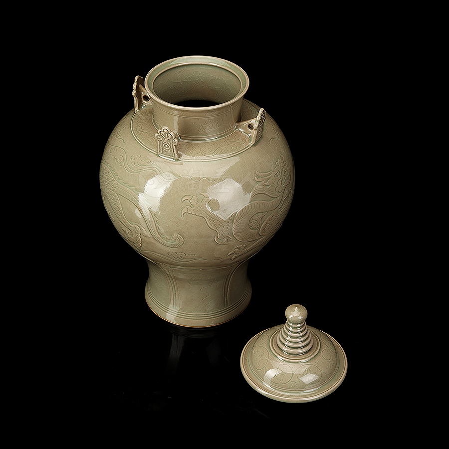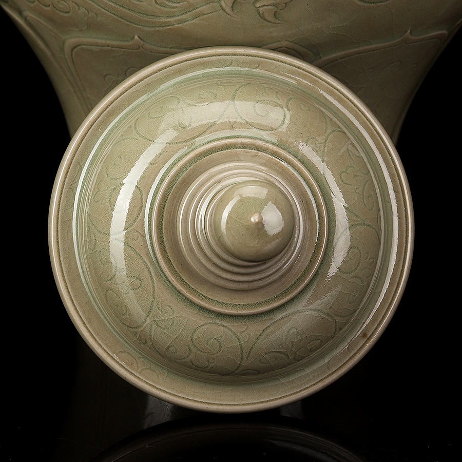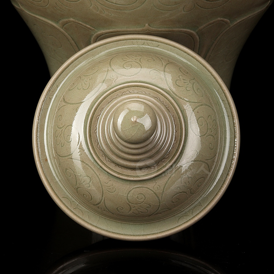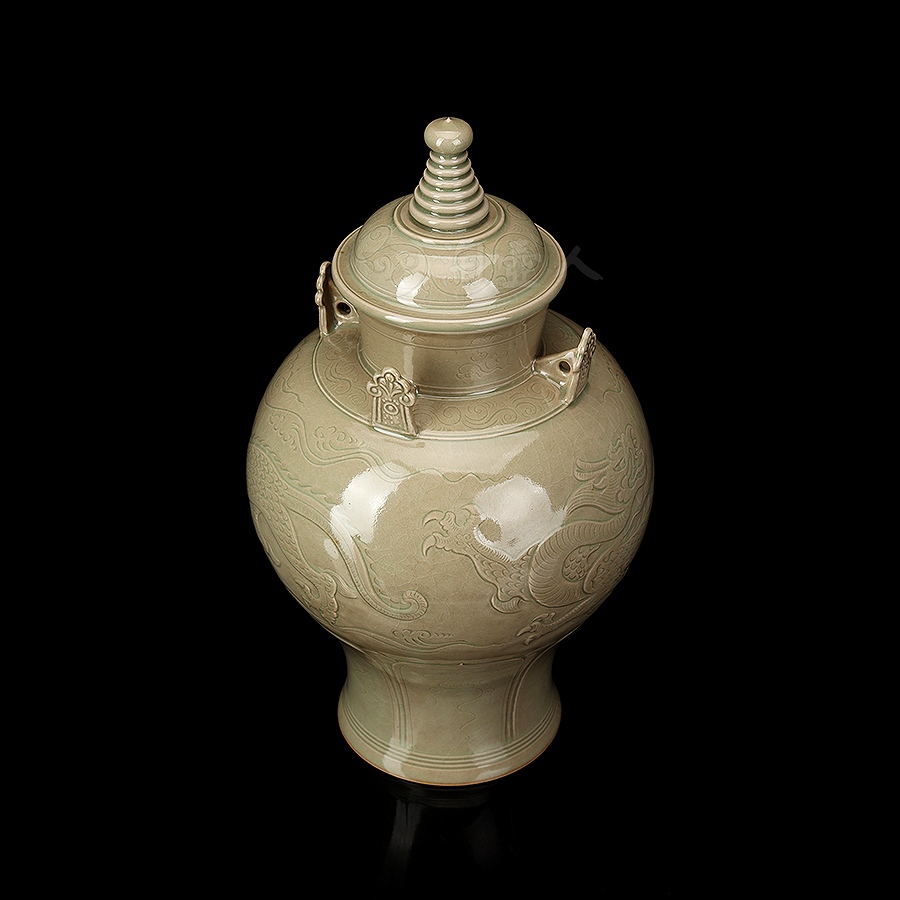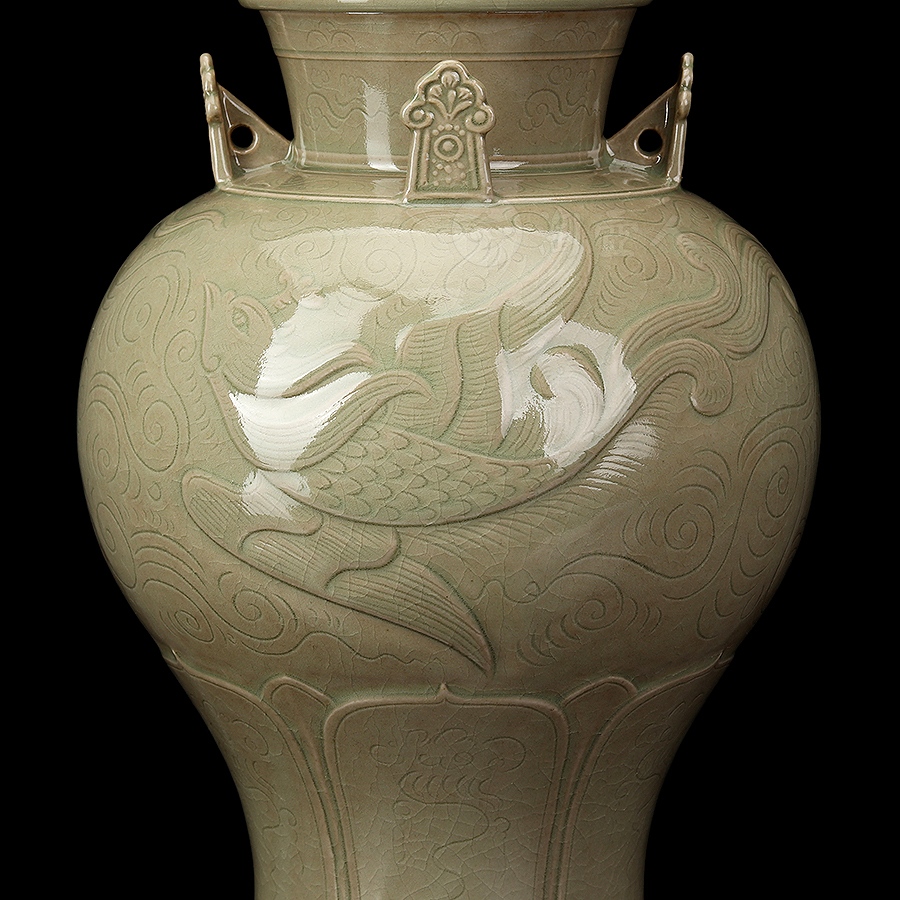 瓶身运用精湛的刻花技法,分别浮雕威仪赫赫的龙与凤,龙腾四海,凤舞九天,鳞羽毕现,神采奕奕,浮雕层次分明,立体感极强,于光影流转间展现出摄人心魄的动态美感,近足处环绕一周双重莲瓣纹饰,宛如莲台托起器身。
