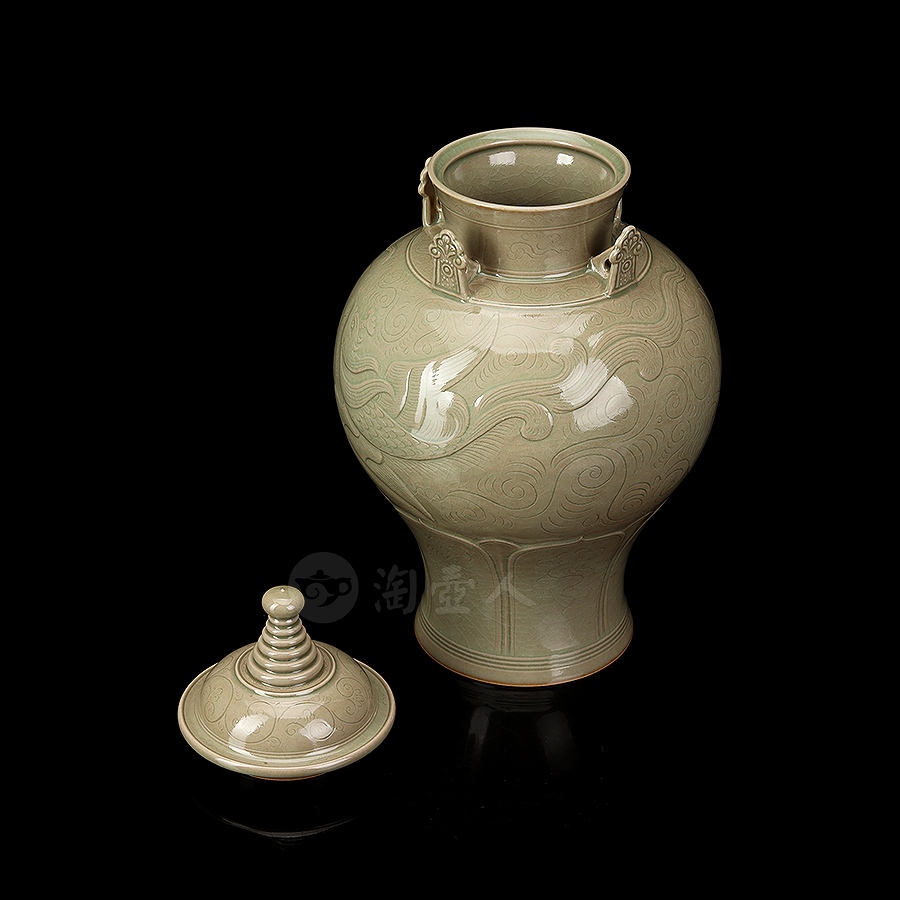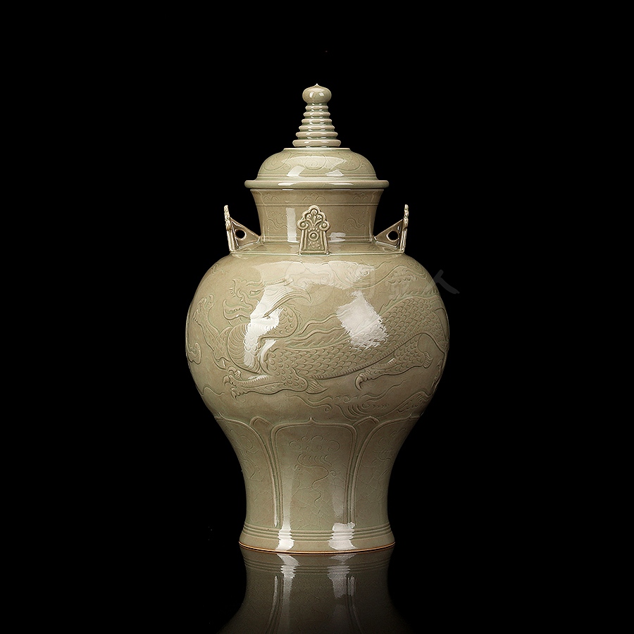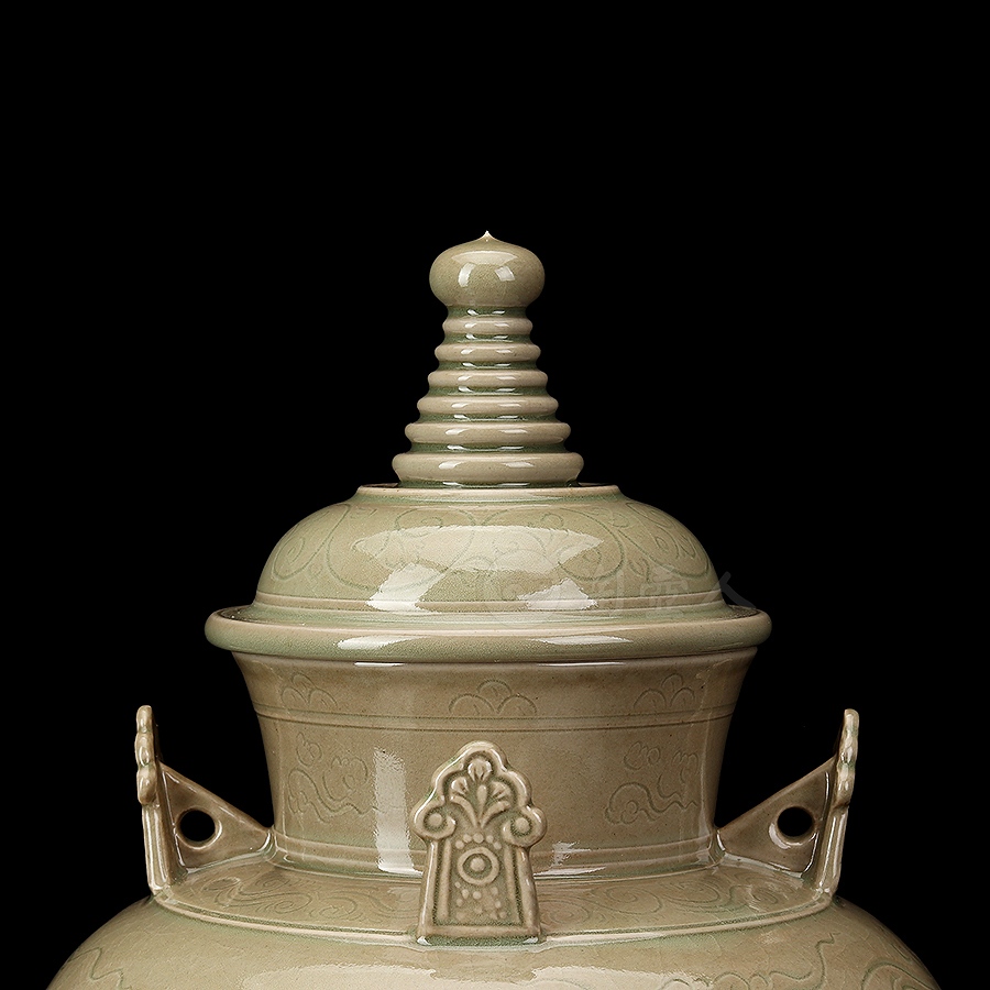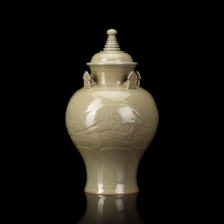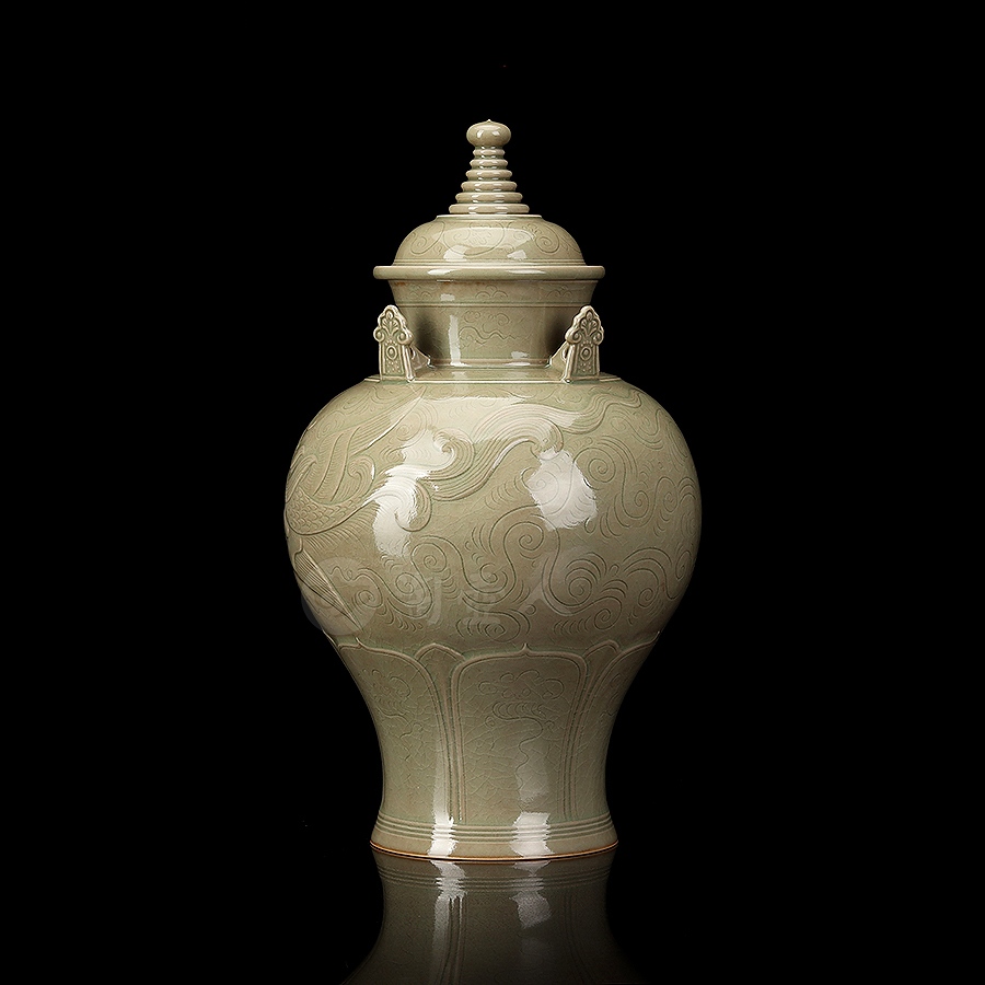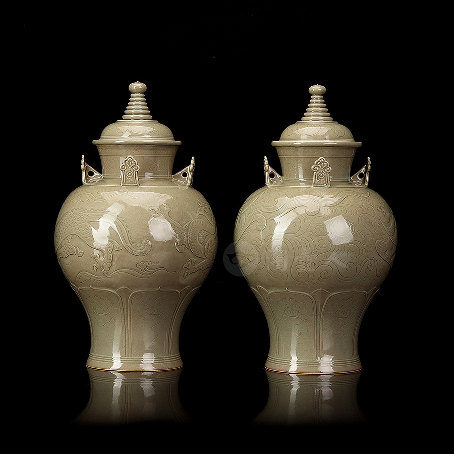 龙凤纹对瓶,堪称张博老师自创器型中的典范之作。此对瓶形制如一,其口沿优雅外撇,颈部高挑挺拔,肩部圆润下溜,腹部饱满如球,至足部则内敛含蓄,整体线条流畅舒展,气韵高古。宝塔形盖钮亭亭玉立,盖面则以缠枝纹装点,平添一份古典雅致。肩部设四只如意玉佩耳,形制古雅,寓意吉祥,为整体造型增色不少。