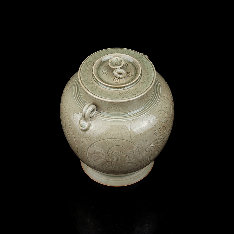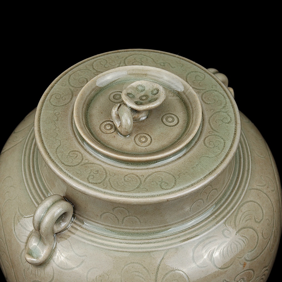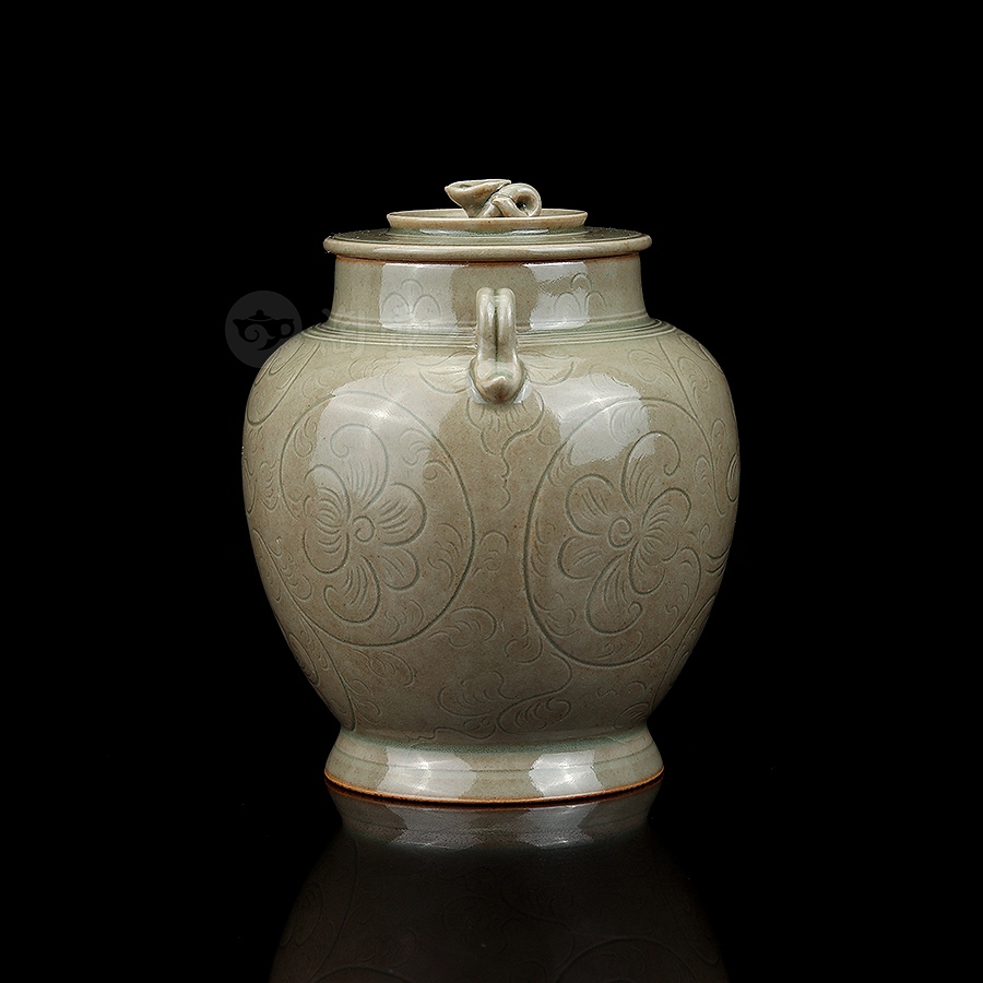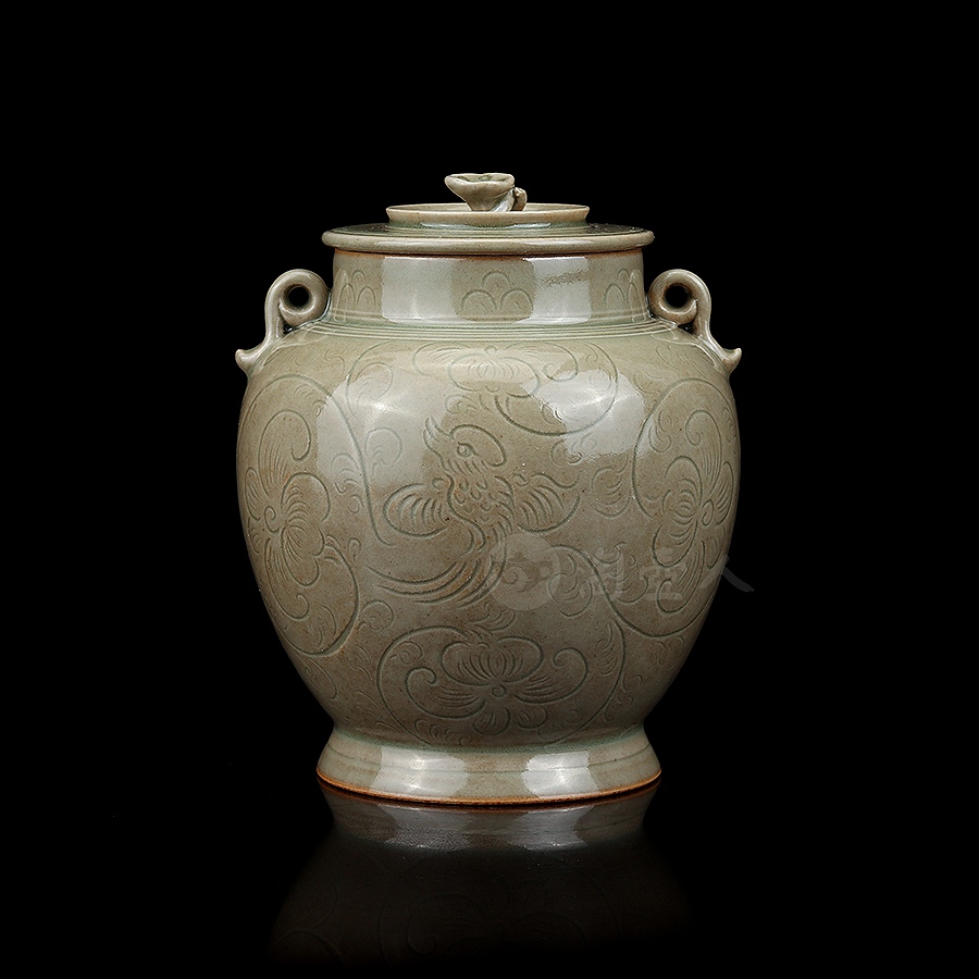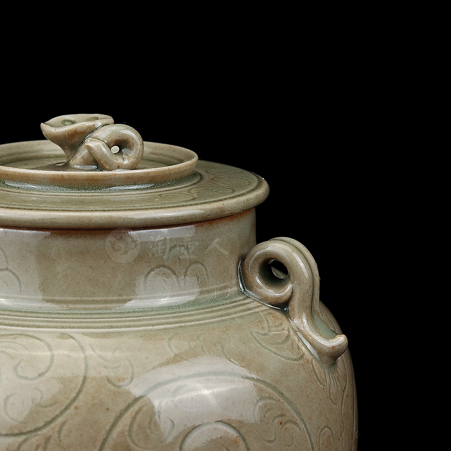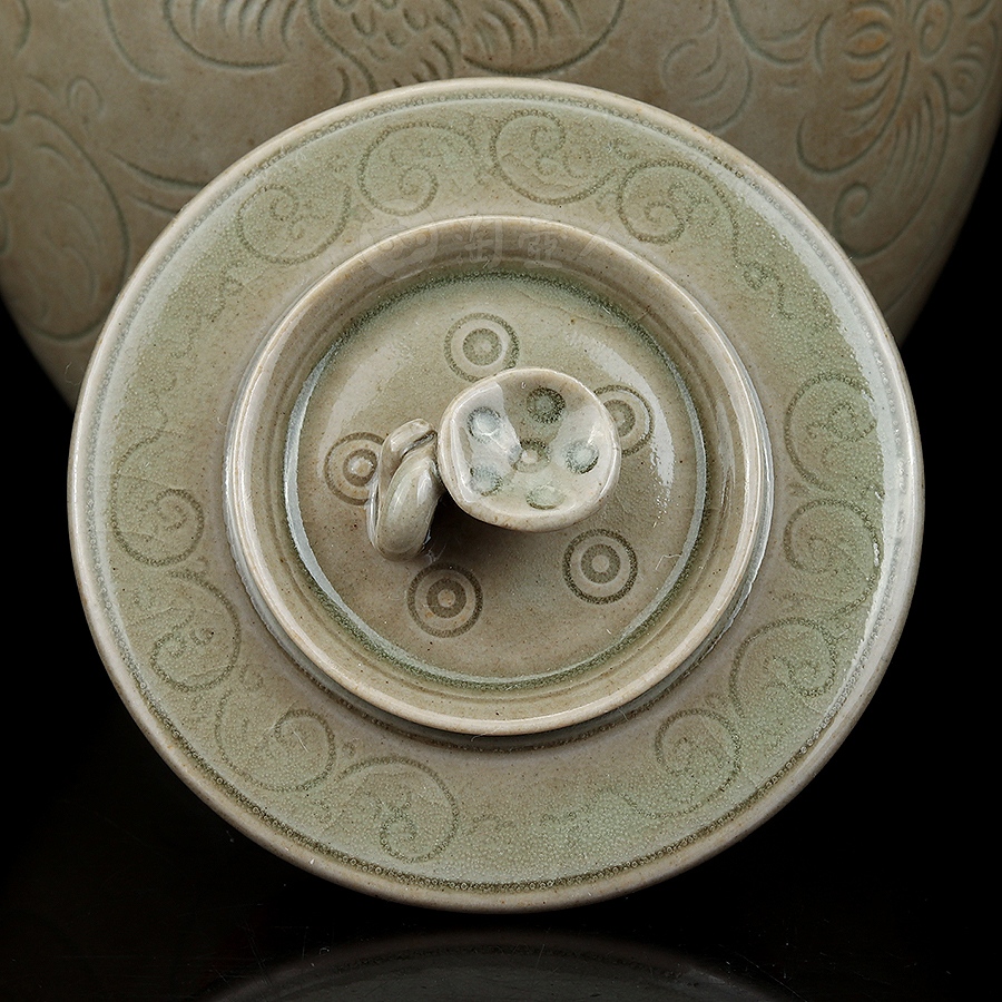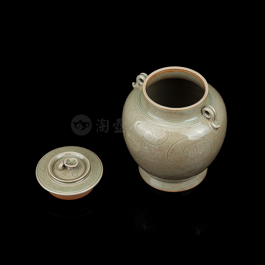 身筒上丰下敛,圈足上敛下丰,器型极为稳重,肩部圆硕,颈部直挺,肩颈以弦纹过渡,两侧分设双系,平盖略大于口沿,盖中又起平台,内凹处置一莲蓬形钮。罐身以半刀泥技法刻花间飞鸟纹,颈部、盖面刻缠枝纹与之呼应。