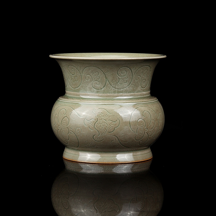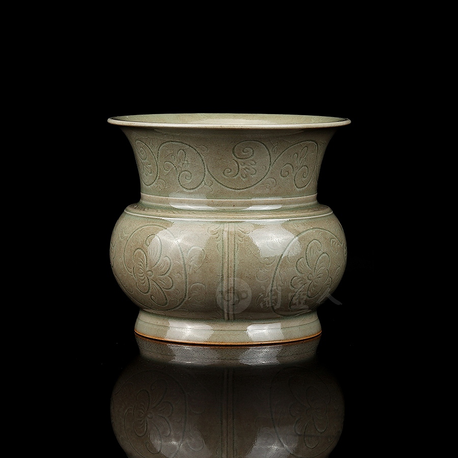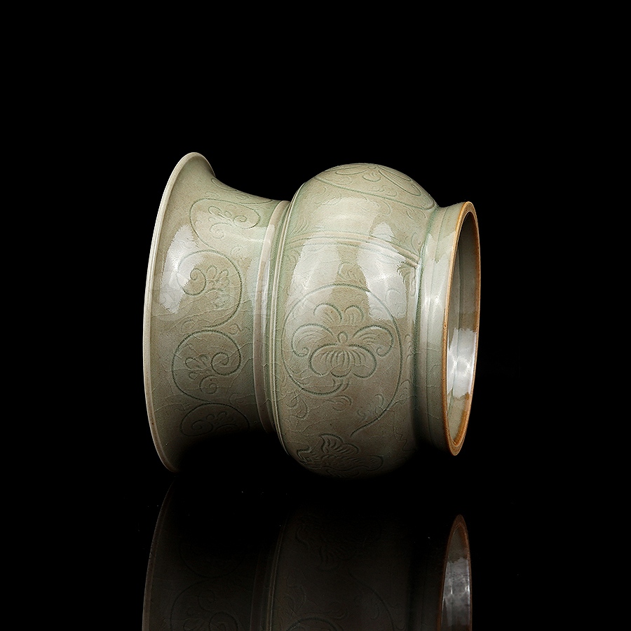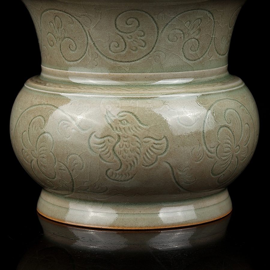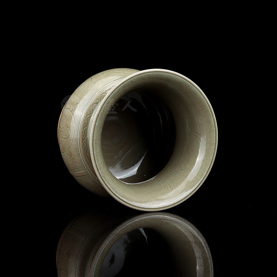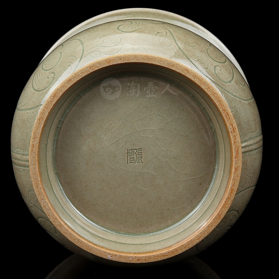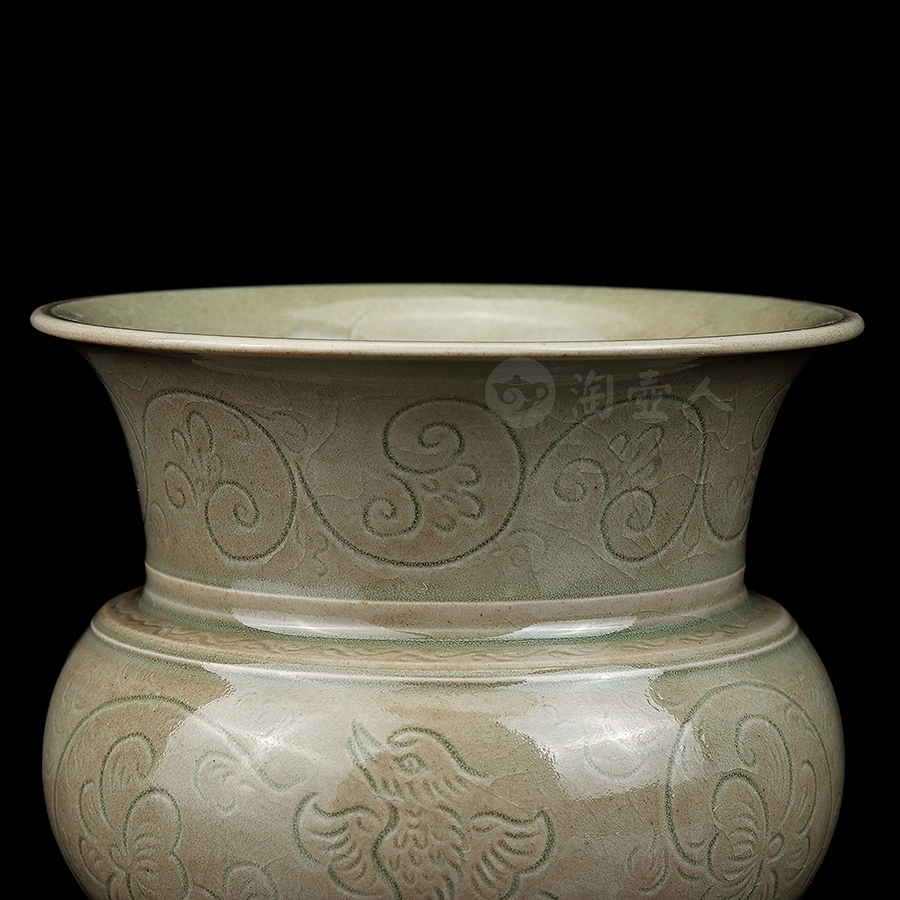 此件渣斗,施秘色釉,釉色古朴,开片细碎,扁球腹,矮圈足,颈高而挺,侈口撇沿,口径几乎与腹径等大,腹部以半刀泥技法精刻花间飞鸟纹,颈部亦饰缠枝纹与之搭配。