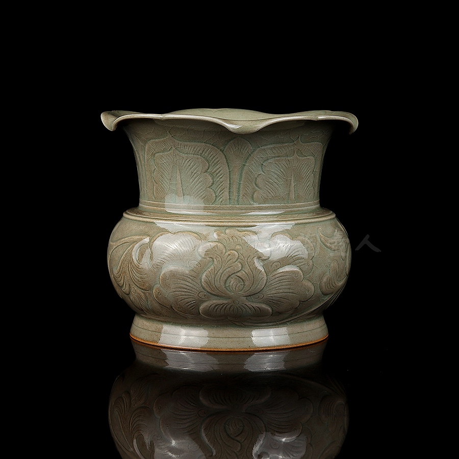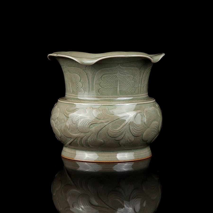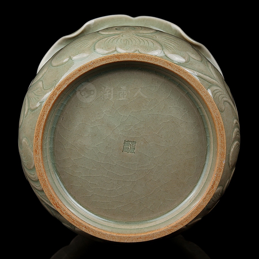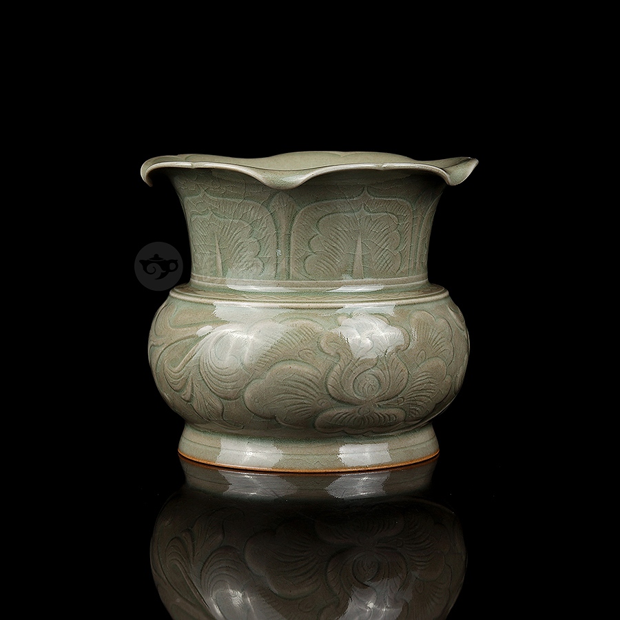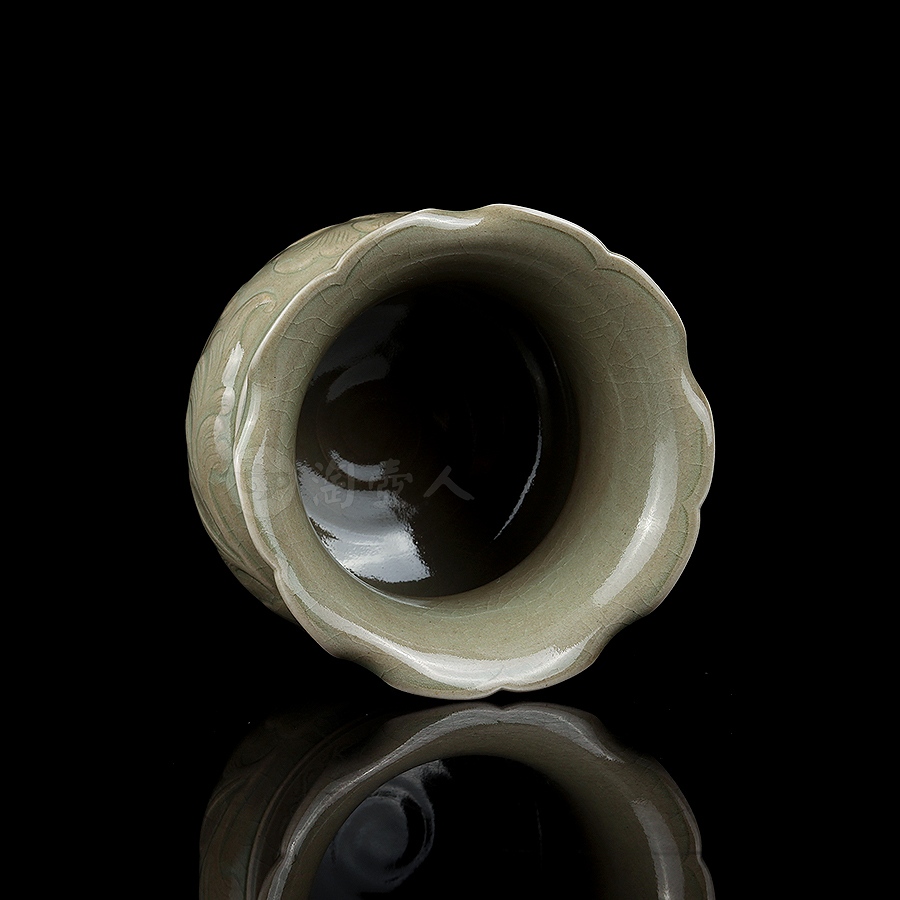 此件渣斗,施秘色釉,釉层饱满,釉色古朴,开片细碎。腹部圆鼓,颈部高而收束,与球腹几乎等高,口沿外撇翻卷,自然随形,极具美感,底部置外撇圈足支撑。以半刀泥阴刻技法装饰器身,颈部刻双层蕉叶纹,腹部刻盛放的牡丹,立体而典雅。