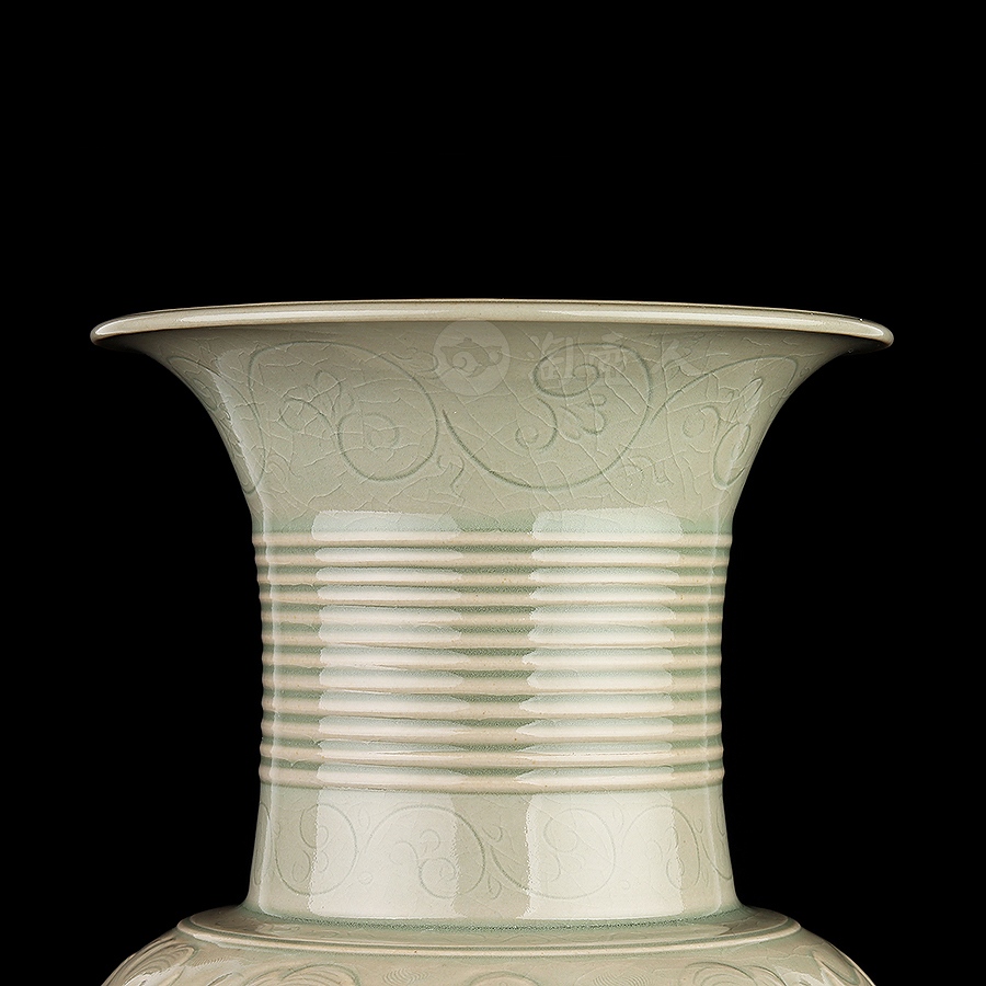 造型规整典雅,比例协调恰到好处,瓶口呈优雅撇口状,线条舒展大方,瓶颈修长束紧,上下分布有缠枝纹样,中部则均匀分布着数道细密弦纹,层次韵律感强烈,勾勒出颈部的挺拔之态。瓶腹为饱满的球形,上丰下敛,曲线流畅,收放自如,底部以圈足稳稳支撑,圈足打磨光滑,宽窄适中,既保证了器物的稳定性,又与整体器型相得益彰。