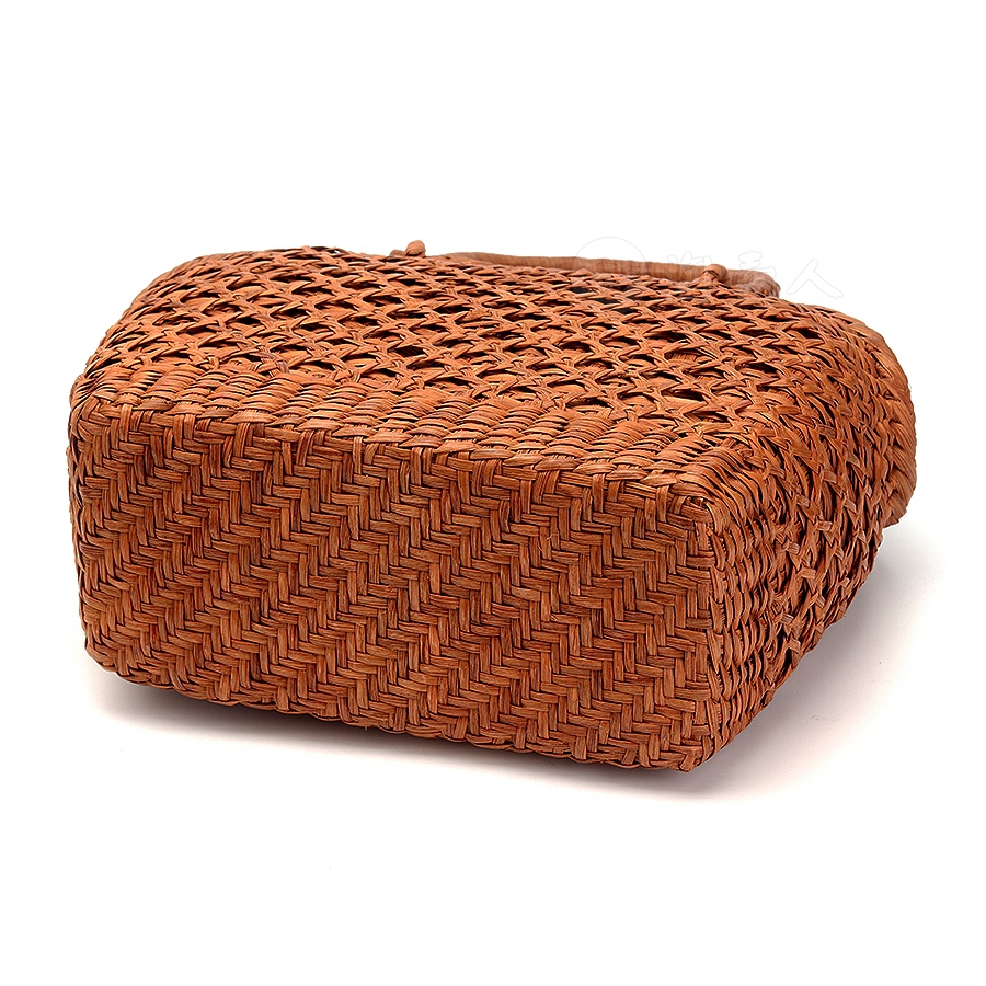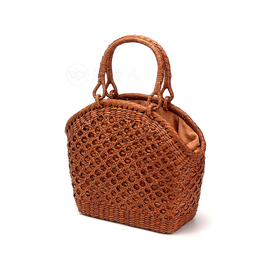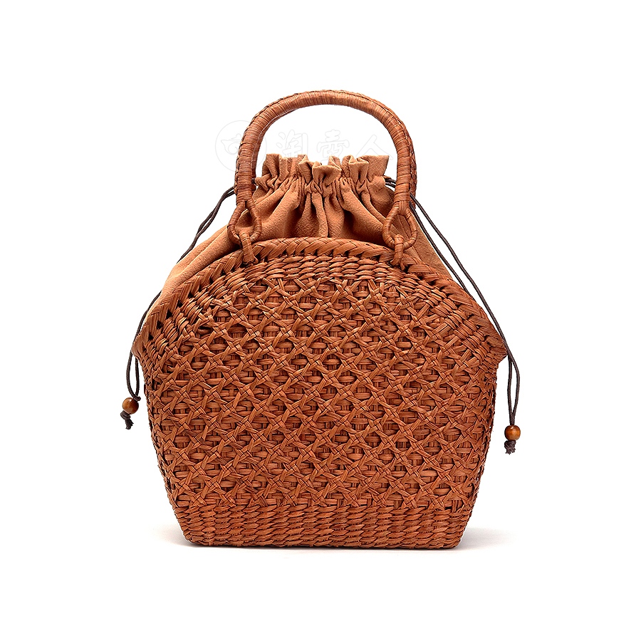 此件云锦藤包,精选高品质野葡萄藤纯手工编成,藤条纤维饱满、质地坚韧,经蒸煮、晾晒、塑形等数道工序处理,不仅赋予藤包出色的防霉、抗蛀性能,更让包身兼具耐用度与挺括感。包型设计尤为用心,弧顶,平底,造型新颖,立挺有型,不易软塌,即便长久使用,依旧能保持规整利落的形态;内置的同色系棉麻抽绳内袋,更是贴心守护小物件,大大降低遗失风险。包身为双层镂空,看似简约却暗藏极高编织难度,非技艺纯熟的匠人难以完成,堪称匠心与自然的珍贵结晶。