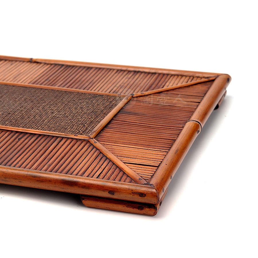 底部经三遍黑漆髹涂,每遍均需经过打磨、上漆、阴干一套完整流程,叠加后形成厚实均匀的保护层,既能有效隔绝潮气、防止竹材霉变,又让底部呈现出沉稳内敛的哑光黑质感;台面则施五遍以上大漆,天然大漆温润通透、防水耐磨,漆料渗透竹肌理,终成琥珀般莹润光泽,既保留了老梅鹿竹的天然纹理,又赋予其细腻顺滑的触感,日常使用养护还能形成独特包浆。